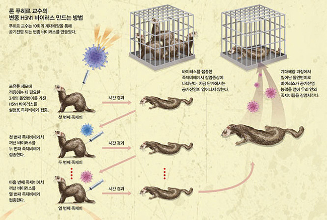 실제로 AI 바이러스는 국내의 조류 농가에 큰 고통을 안겨준 바이러스입니다. 인체 감염은 잘 일어나지 않지만 전염되는 경우 치사율이 60%에 가깝습니다. 2012년 네덜란드 에라스뮈스 메디컬센터 연구진은 H5N1에 유전자 돌연변이를 일으킨 뒤 실험용 족제비들 사이에서 계대감염을 시키자 10번째에 이르러 이 바이러스가 영화처럼 공기전염 능력을 획득하는 것을 확인한 바 있습니다.