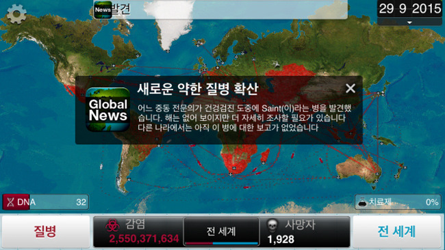 그러나 이에 대항하는 인류의 노력이 방해 작용을 하는데요. 서아프리카 에볼라 바이러스 사태에서 볼 수 있듯 전 세계가 막대한 자본을 투여해 치료제를 개발하기 시작하면 플레이어가 조종하는 병원체는 거꾸로 멸종당할 위기에 처합니다.