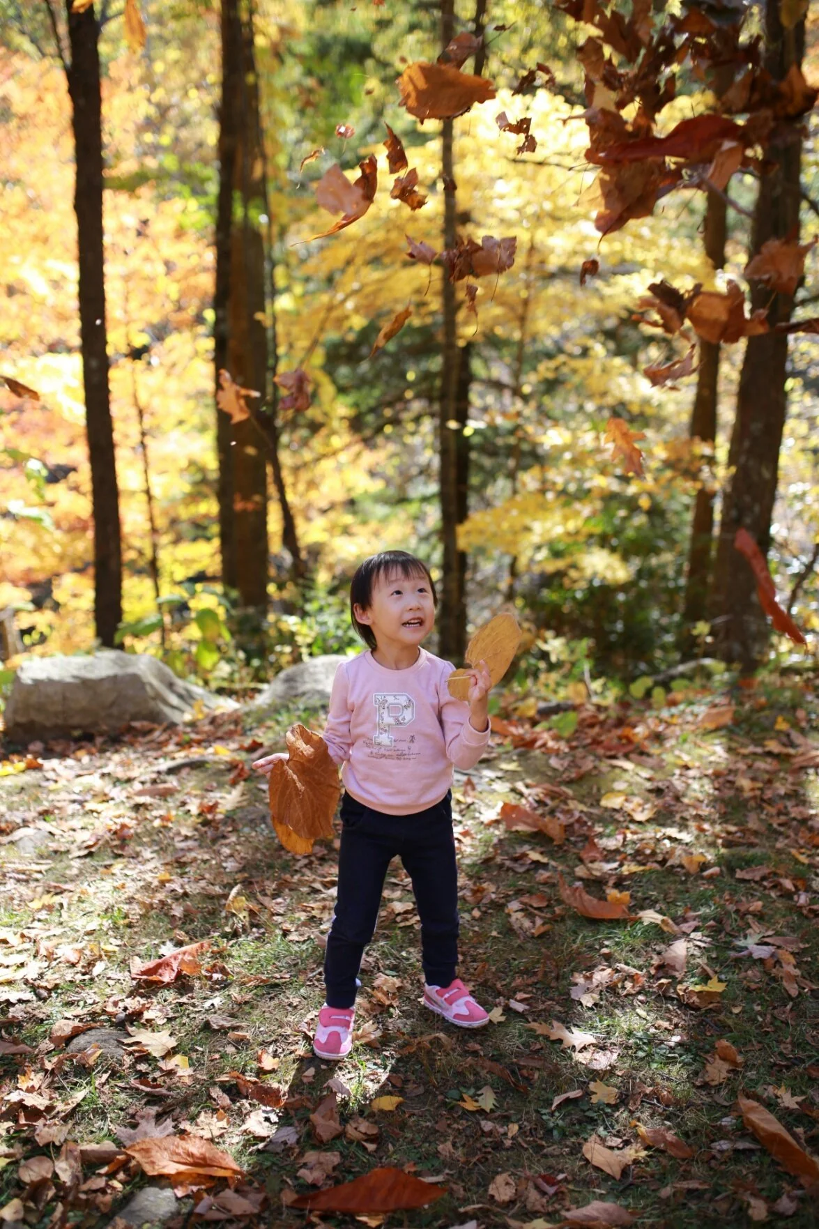 다음날 우리는 본격적으로 단풍을 찾아 길을 나섰다. 날씨가 화창한 주말과 맞물려 전국에서 모인 차들의 번호판이 좁은 도로를 꽉 메웠다. 교통체증을 뚫고 멀리서 바라보던 전경 속으로 점차 들어갔다. 파란 하늘과 단풍의 보색 대비가 강렬하다. 개울가의 숲은 온통 노랗게 물들어 있었다. 지호는 큰 나뭇잎을 양손에 쥐고 날개처럼 파닥거렸다.