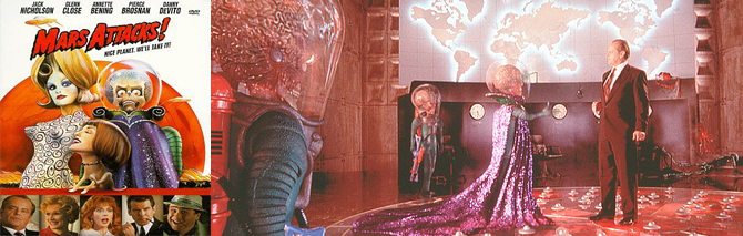 실제로 영화 속에서 화성인들은 지구인을 머리 위에서 지배하며 농락하는 문명인으로 등장합니다. 러시모어 큰 바위에 새겨진 위인의 얼굴을 화성인의 얼굴로 바꾸고, 이스터섬의 조각들로 볼링을 하죠. 코미디 장르답게 지구를 침략한 화성인이 지구인을 장난감처럼 다루는 모습이 위협적이라기보다는 우스꽝스럽게 그려집니다.