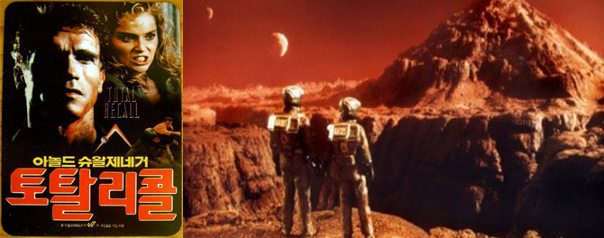 1990년대 당시 바이킹이 촬영한 사진들을 바탕으로 화성 표면을 정밀하게 묘사한 영화 ‘토탈리콜’에서는 화성이 식민지화되어 암울한 모습이 그려집니다. 이 식민지는 지구와 같은 환경을 유지하기 위해 유리벽으로 외부와 차단돼 있습니다. 화성인의 모습도 돌연변이로 배척당하는 이방인의 이미지가 큽니다.