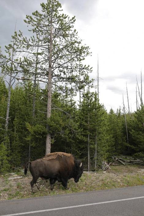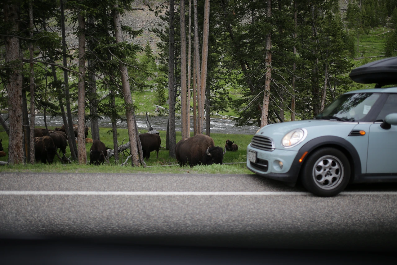 사람들은 차창 밖으로 휴대폰을 꺼내 바삐 셔터를 눌렀다. 바이슨은 카메라 세례가 익숙한 듯 무심히 지나갔다. 우리도 매우 가까운 거리에서 바이슨을 목격했다. 바이슨은 털이 덥수룩하고 굵은 뿔이 나 있다. 예전에 동물원에서 본 바이슨은 좁은 공간에 배설물을 가득 쌓은 채, 뒤엉킨 털을 덮어쓰고 귀신처럼 섬뜩하게 우리를 바라봤던 걸로 기억한다. 옐로스톤에서 만난 바이슨은 차들을 홍해처럼 가르며 누구보다 자유롭게 런웨이 쇼를 펼쳤다. 이게 바로 바이슨의 참 모습이었구나.