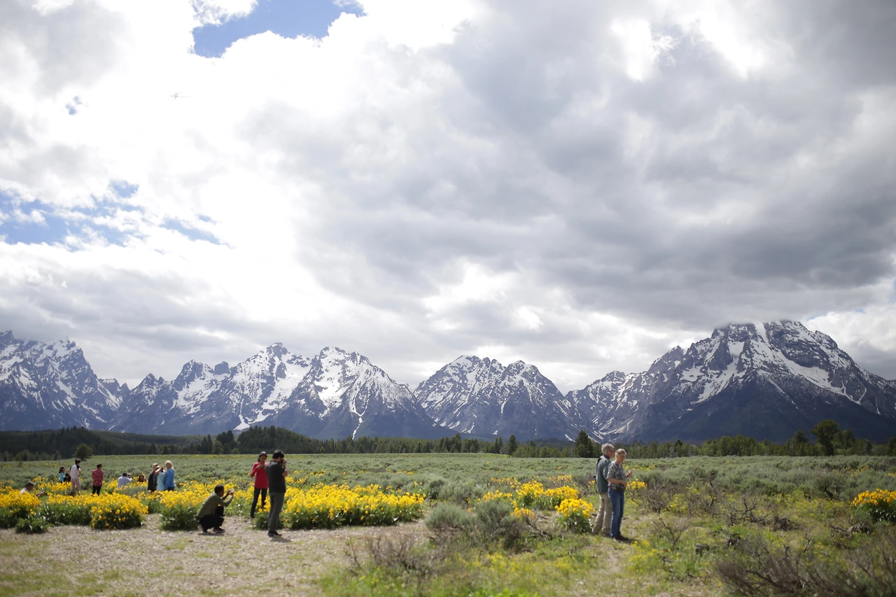 옐로스톤에 들어가기 앞서 그랜드티턴 국립공원에 발을 들였다. 좁은 흙길을 따라 걷자 눈 덮인 산맥으로 둘러싸인 파란 잭슨 레이크가 나타났다. 하늘에 구름이 많아서 그랜드티턴의 뾰족한 산봉우리 끝이 뭉툭하게 보인다. 호수에서 나와 도로를 달리니, 우뚝 솟은 산봉우리들이 점점 더 가까워지며 우리를 내려다봤다. 구름이 하늘을 가려서 초록 풀밭이 채도를 잃었다. 그 위로 듬성듬성 들꽃들이 피어있다. 추위 속에 피어있는 꽃이라선지 애잔하게 아름답다.