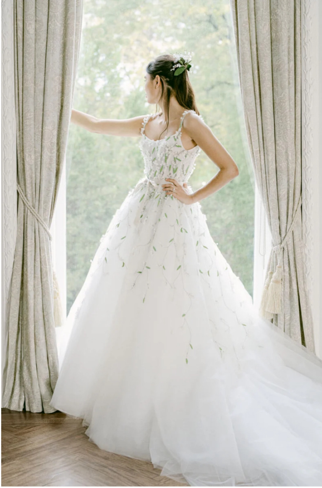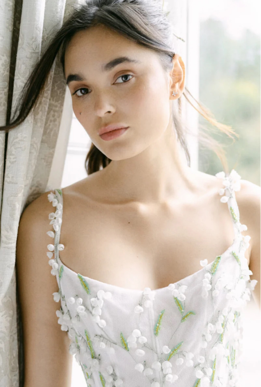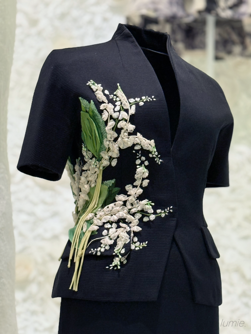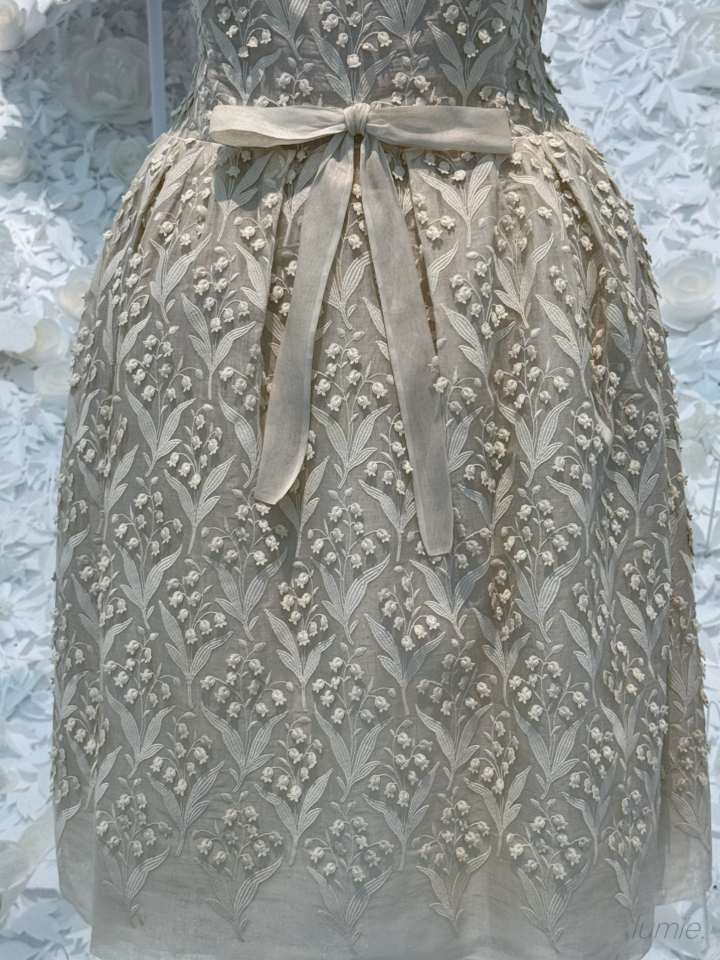 하얀 바탕 위에 스며든 은방울꽃 자수, 그리고 그 위로 흘러내리는 듯한 봄의 기운.