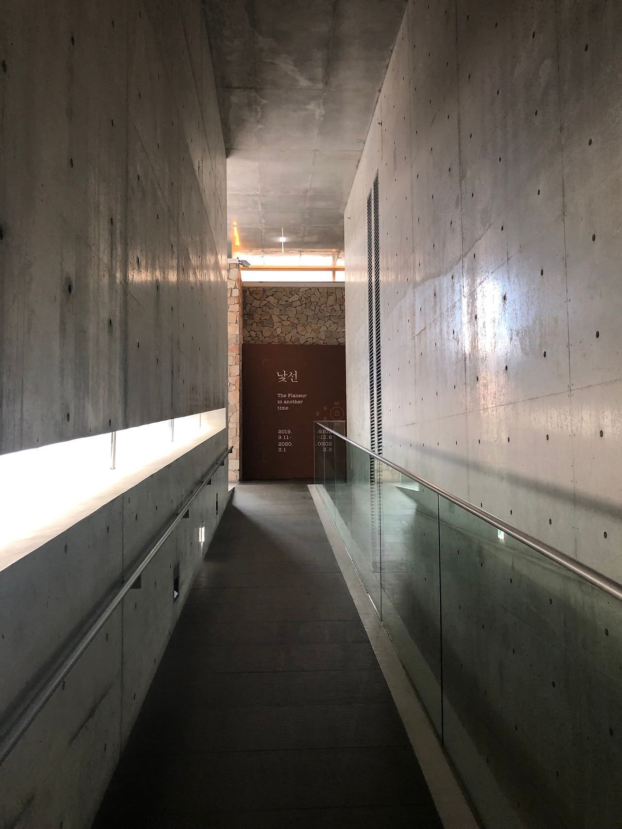 각각의 전시관으로 향하는 길 복도를 따라 걷다 보면, 안도 타다오 건축의 진수를 온몸으로 느낄 수가 있다. 안도 타다오 건축의 3요소는 빛, 물, 노출콘크리트로 압축된다고 한다. 매끄럽게 마감된 노출콘크리트와 돌로 지어진 높은 벽과 함께 긴 복도가 곳곳에 존재하는데, 벽의 윗부분에, 또는 아랫부분에 자연광이 새어 들어오도록 설계가 되어 있어 그 모습이 환상적이다.