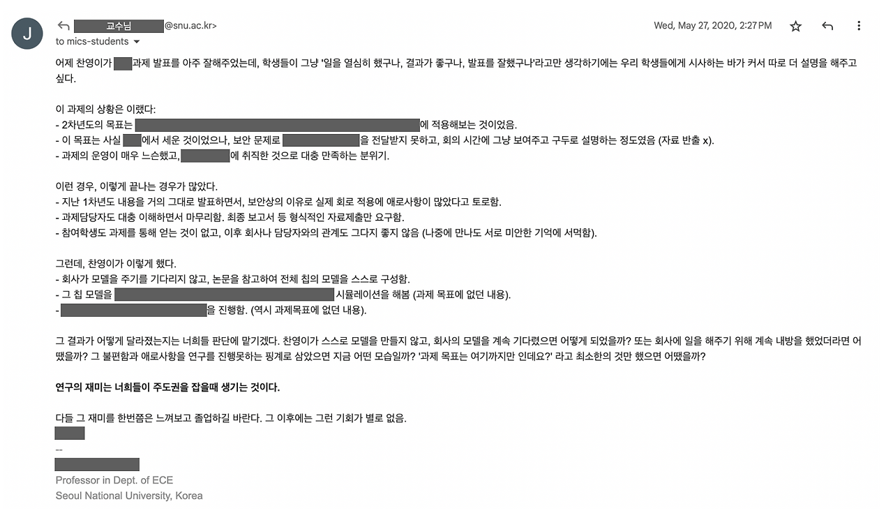 대학원에서도 마찬가지였다. 기업 과제 발표가 끝난 뒤 교수님이 전체 메일로 내 이름을 언급하셨다. “찬영이는 과제 진행의 불편함을 핑계 삼지 않았고, 최소한만 하지도 않았다. 연구의 재미는 주도권을 잡을 때 생긴다. 다들 그 재미를 한 번쯤은 느끼고 졸업하길 바란다.”