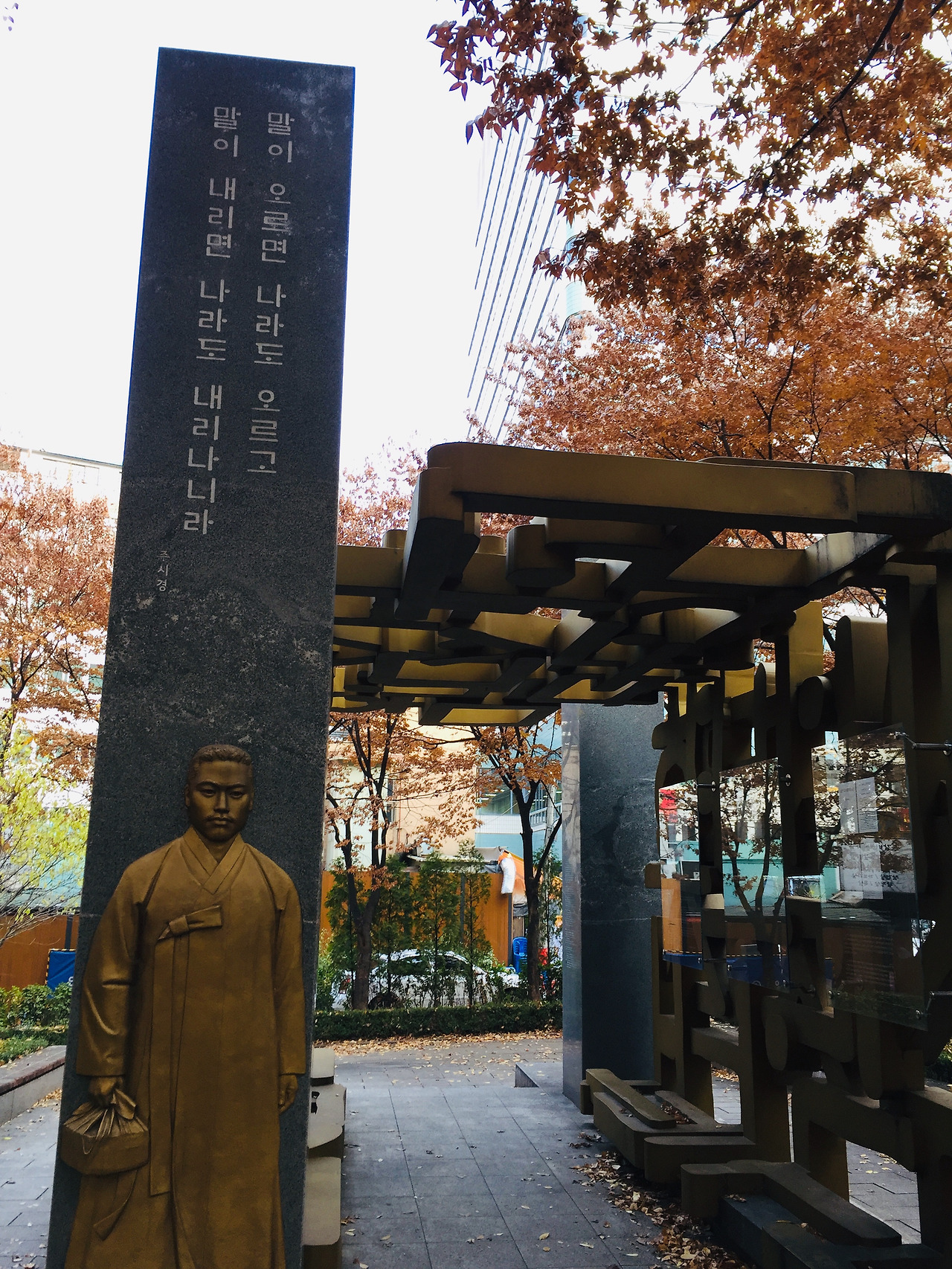 그 길목에는 '용비어천가'라는 오피스텔도 있는데 평소 이름이 독특해서 기억하고 있었다. 그 배경을 알고 보니 가난했던 주시경 선생이 기증받아 살던 집이 그곳이었단다. 그래서 의미 있는 이름으로 변경하게 된 것! 이 건물 앞에는 주시경 가로등과 주시경 마당이라는 공원이 있다.