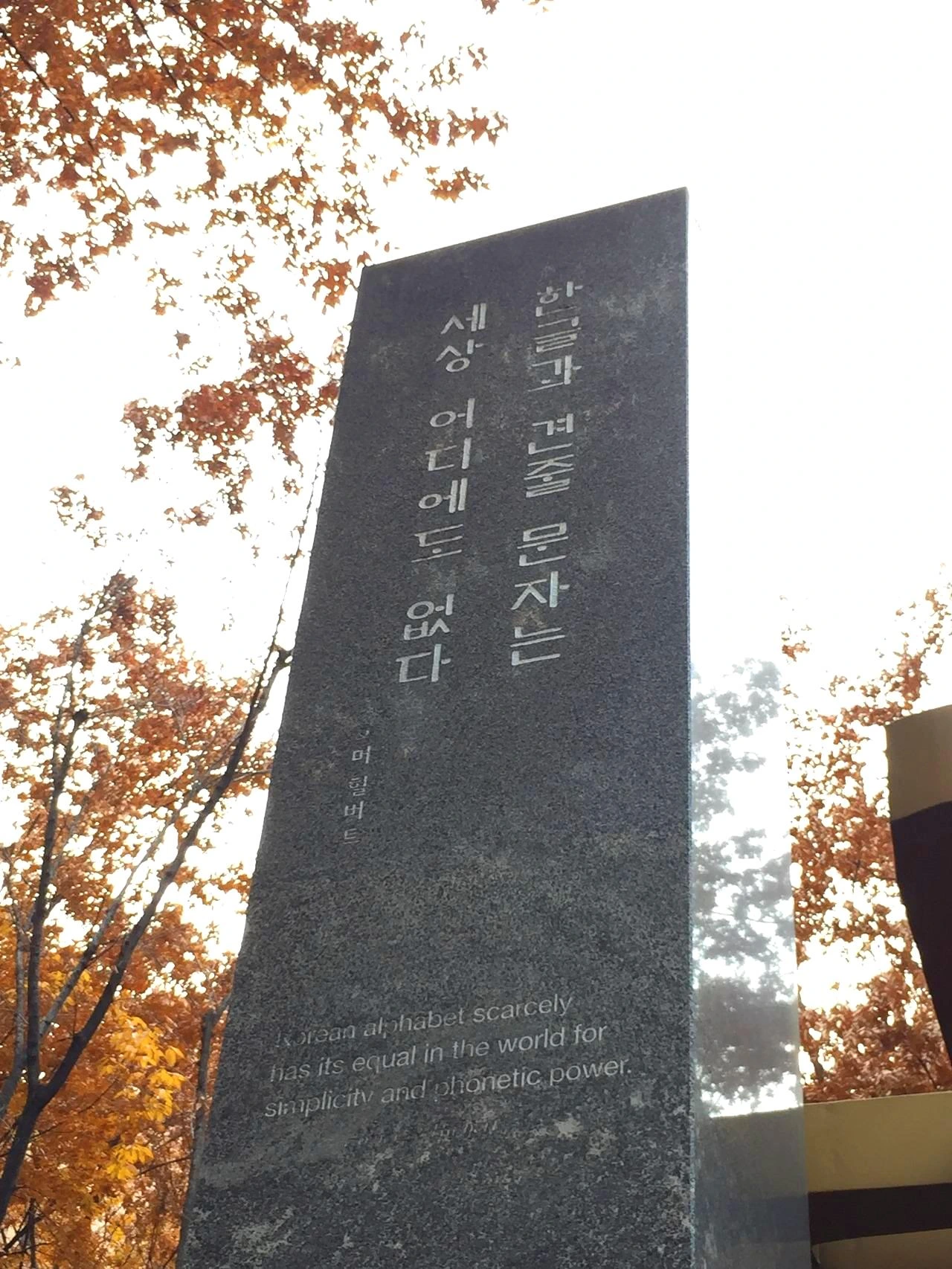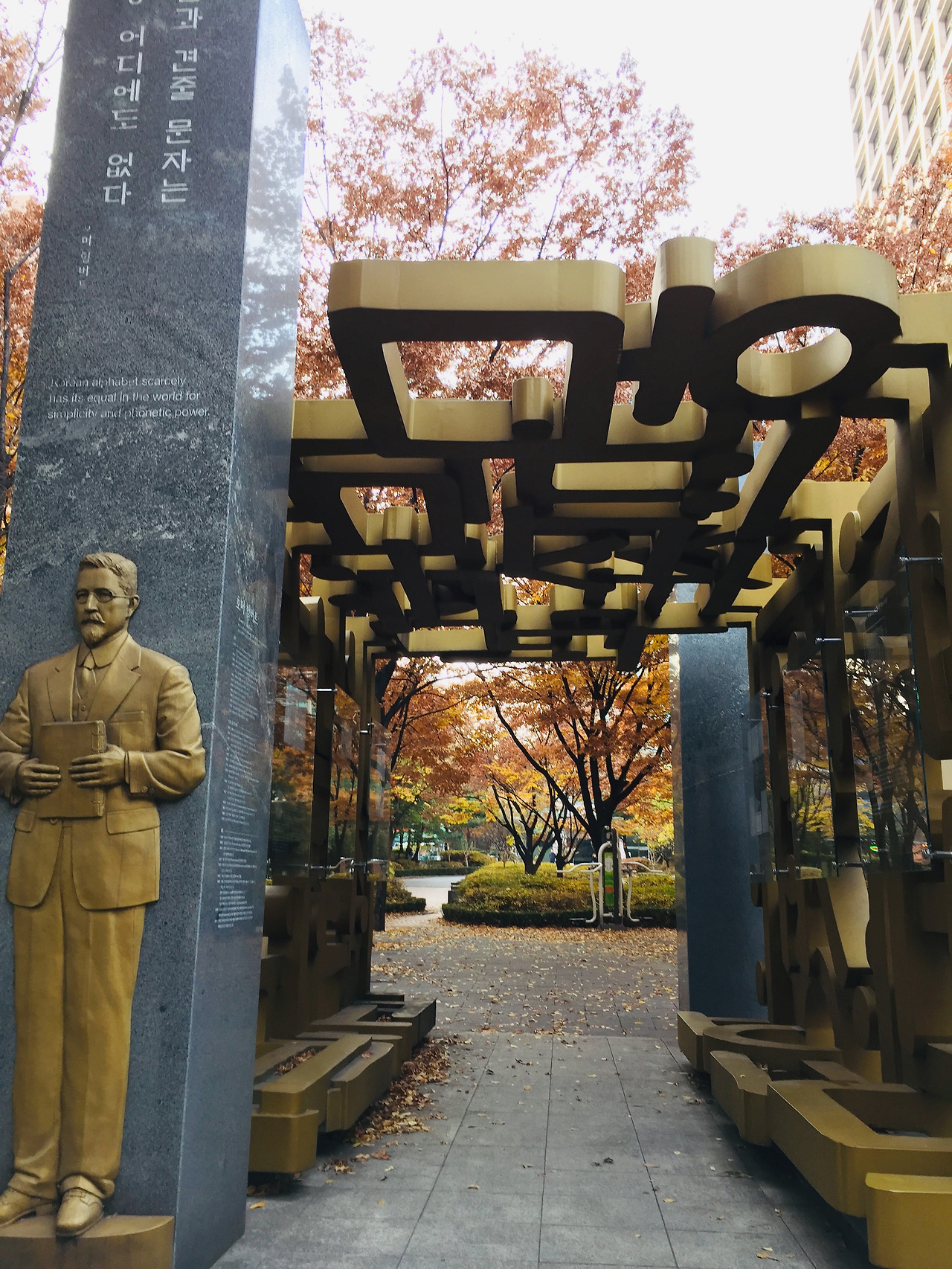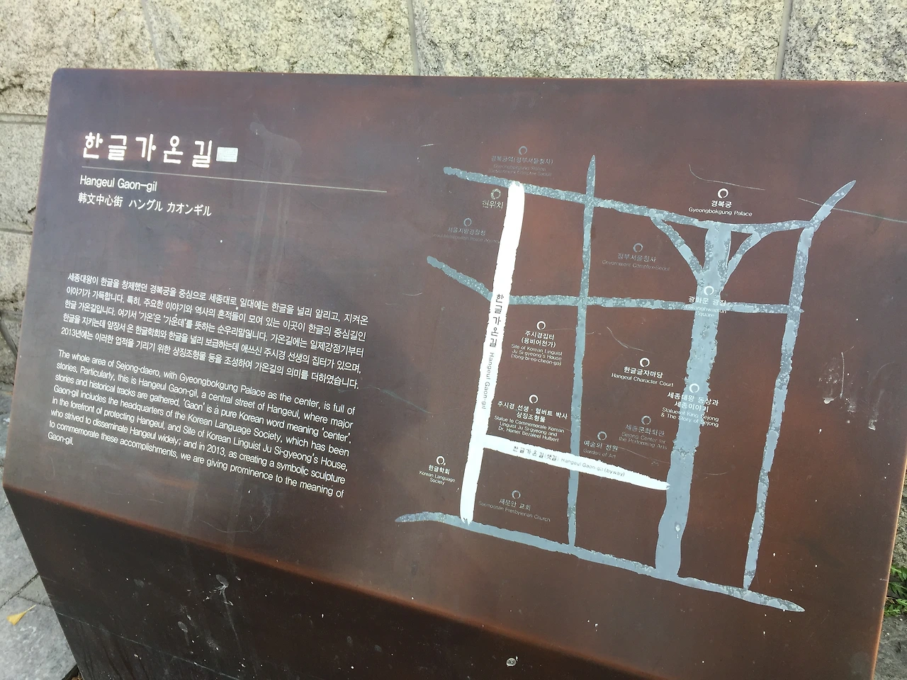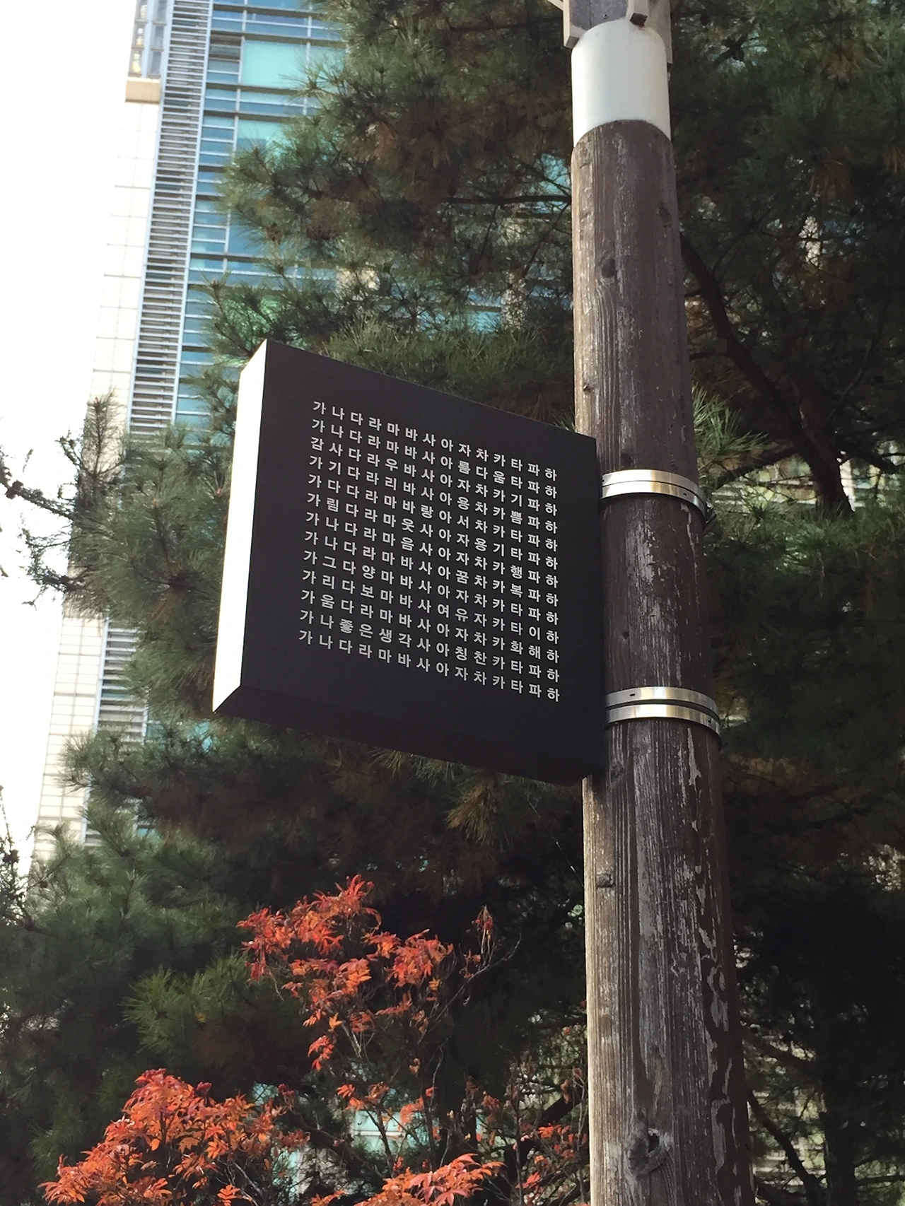 경복궁역 7번 출구에서 유명 브랜드 오피스텔 방향으로 들어가는 코스이다. 일명 '한글 숨바꼭질 18' 코스인데 한글로 여기저기 조형물 또는 장식물이 배치되어 있다. 하나둘 발견할 때마다 얼마나 재미있던지 의미 있는 길답게 창의적인 요소를 곳곳에 숨겨두어 새로웠다. 예를 들면, 단 하나의 가로등과 가로수에 한글 디자인이, 건물에 윤동주 님의 시가 적힌 현판이, 군데군데 한글로 디자인한 조형 요소들이다. 눈을 크게 뜨고 찾아보아야 보인다. 그래서 '숨바꼭질'인 듯!