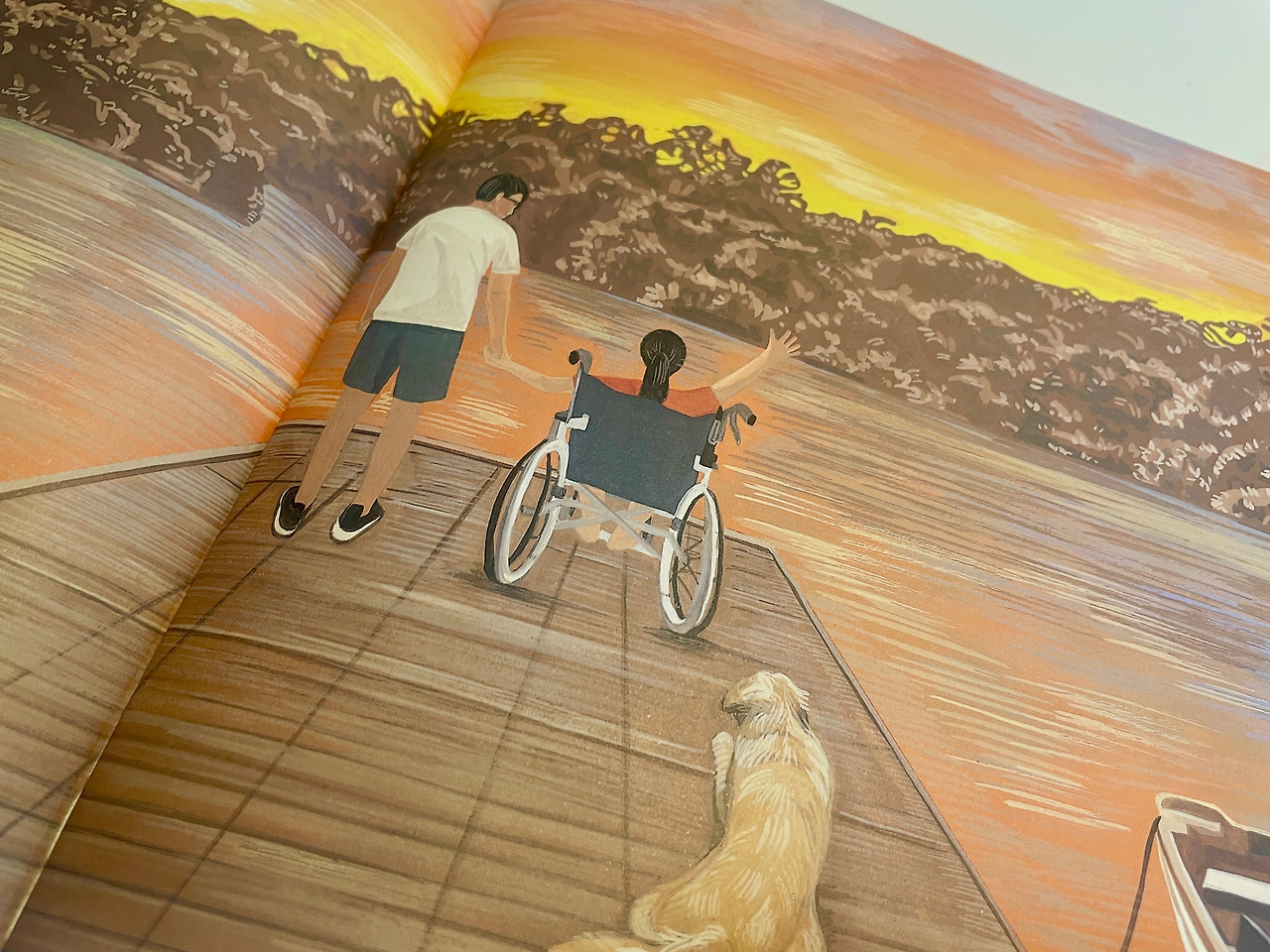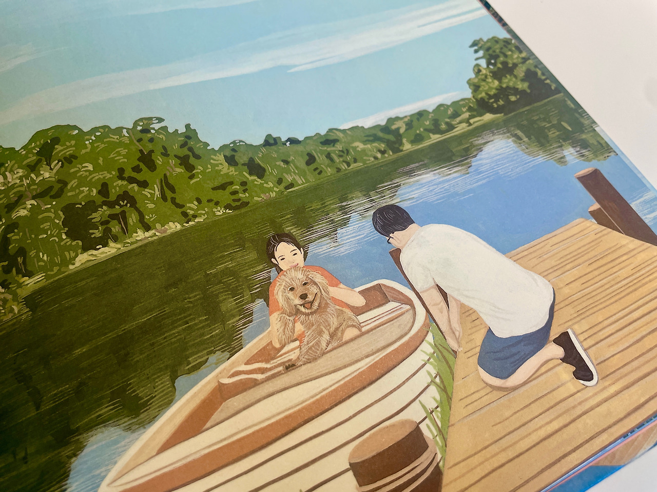 그림책을 넘기자 아빠와 골든 레트리버쯤으로 보이는 강아지와 함께 소녀는 나룻배를 타고 호수 한가운데를향해 노를 저어 가요. 꼭 그림책 속 호수 장면이 저의 청춘의 시절, 바나나 보트를 타고 다 함께 “와~” 함성을 지르며 물에 빠져 즐거워했던 그곳을 떠올리게 합니다.