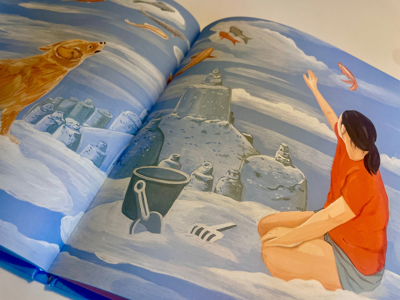 구름 위가 바닷가 모래밭인 듯 춤도 추고, 구름으로 구름 성도 지어보고…시간이 얼마나 흘렀을까 바람이 호수를 쓰다듬었는지 흘러내리는 구름 물결을 타고 물속으로 풍덩 빠진 강아지와 소녀는 첨벙~ 어느덧 붉게 물든 하늘을 뒤로한 채 아빠와 함께 나룻배를 타고 돌아와요.