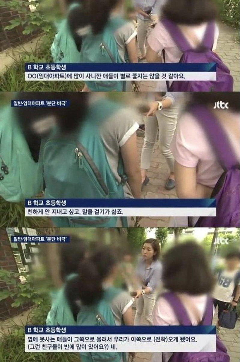 2000년대 이후 우리는 임대아파트와 분양아파트 주민 간의 갈등 기사를 수시로 접하게 된다. 분양 아파트의 주민들이 아이들을 임대아파트 아이들이 다니는 학교로 보내지 않으려 하고 임대 아파트 주민들이 자신들의 단지로 다니지 못하게 길을 막아버리기도 하며 심지어 아파트 외벽의 색을 다르게 칠해 구분을 짓는 시대를 우리는 살아가고 있다.