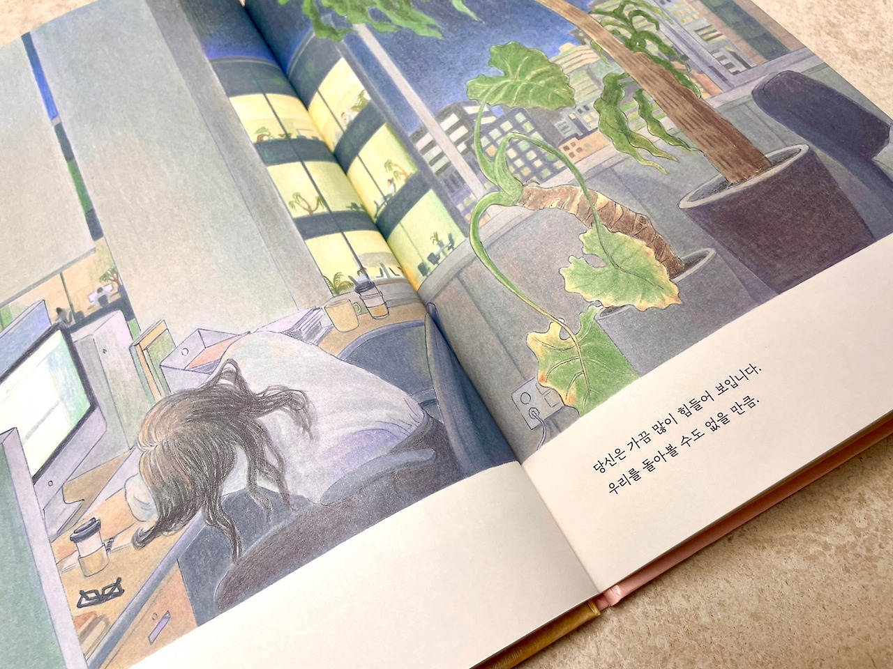 그림책 속의 굽어진 등을 뒤로한 채 책상에 엎드려있는 모습이