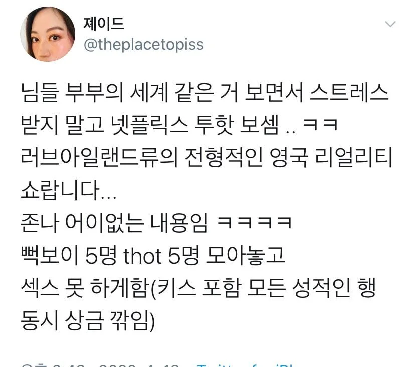 트위터 원문을 봤는지, 이걸 캡처한 커뮤니티 글을 봤는지 기억은 안 났지만 설정 자체가 어이없어서 기억하고 있었다. '어... 섹스 못 하는 게 그렇게 죽을 일이야...?' 싶었으니까. ㅋㅋㅋㅋㅋㅋㅋㅋㅋㅋㅋㅋㅋ