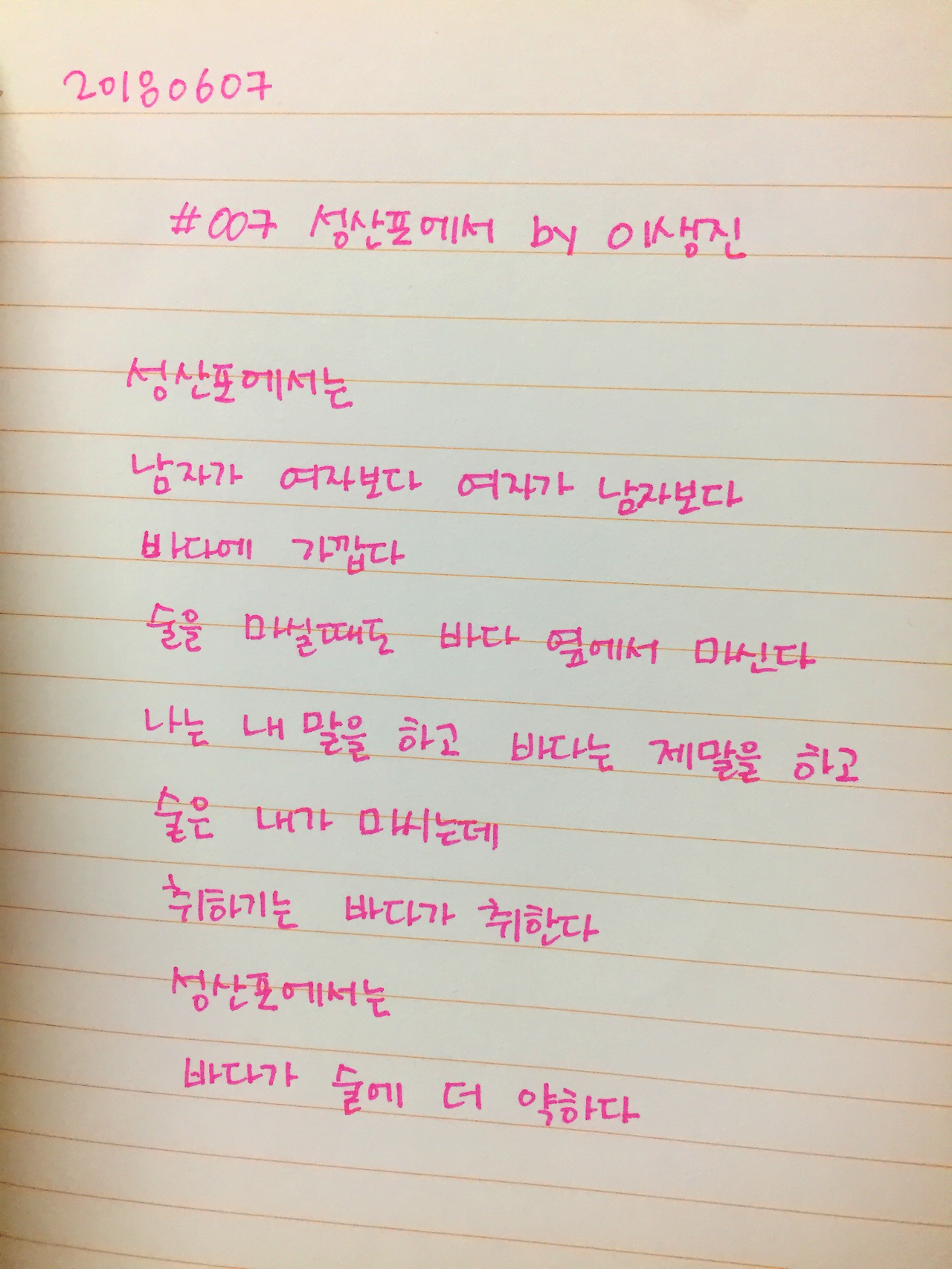 성산포에서는 남자가 여자보다 여자가 남자보다 바다에 가깝다술을 마실때도 바다 옆에서 마신다나는 내 말을 하고 바다는 제 말을 하고술은 내가 마시는데 취하기는 바다가 취한다성산포에서는바다가 술에 더 약하다#1일1시 #100lab