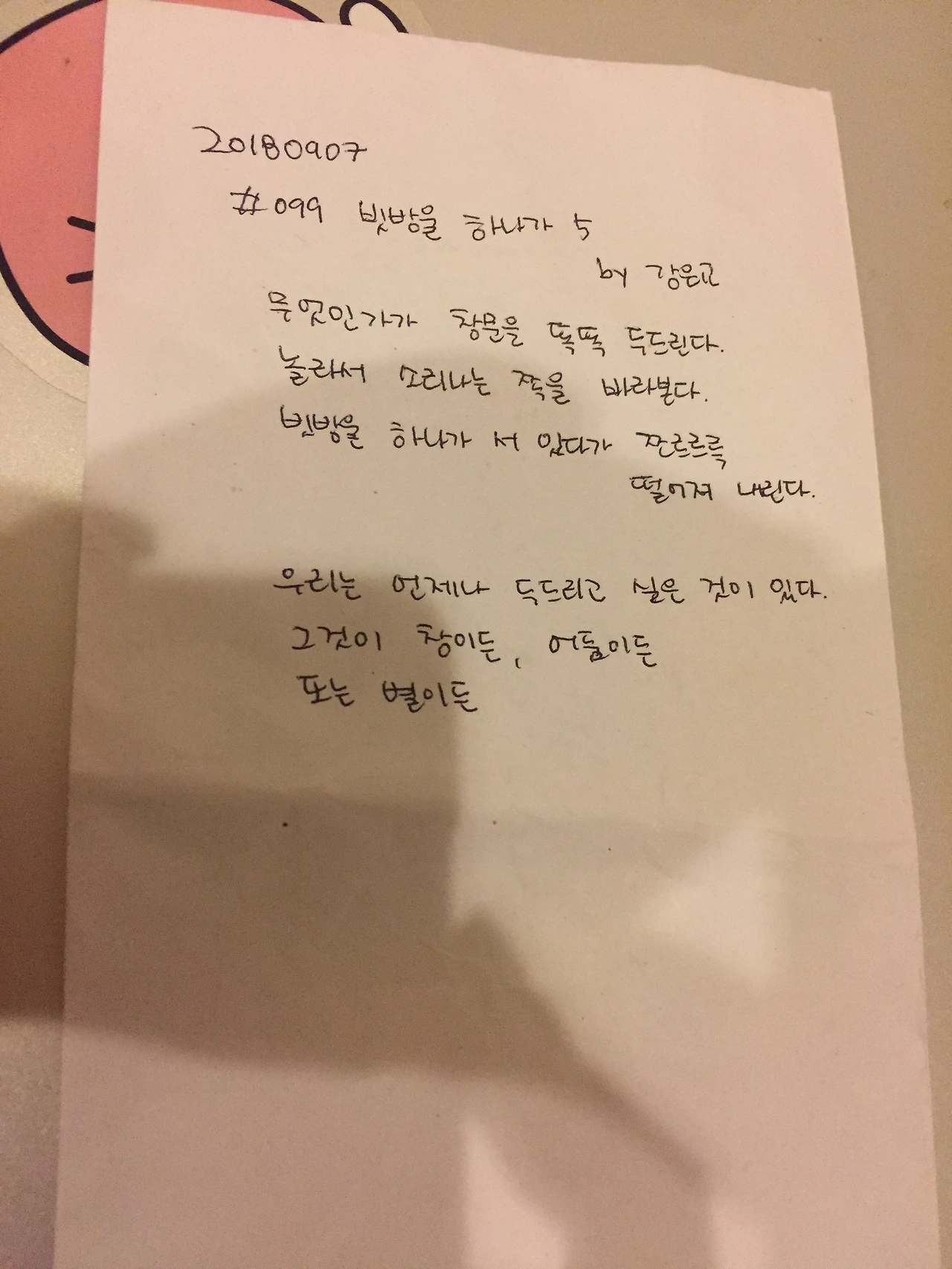 무엇인가가 창문을 똑똑 두드린다.놀라서 소리나는 쪽을 바라본다.빗방울 하나가 서 있다가 쪼르르륵 떨어져 내린다. 우리는 언제나 두드리고 싶은 것이 있다.그것이 창이든, 어둠이든 또는 별이든.