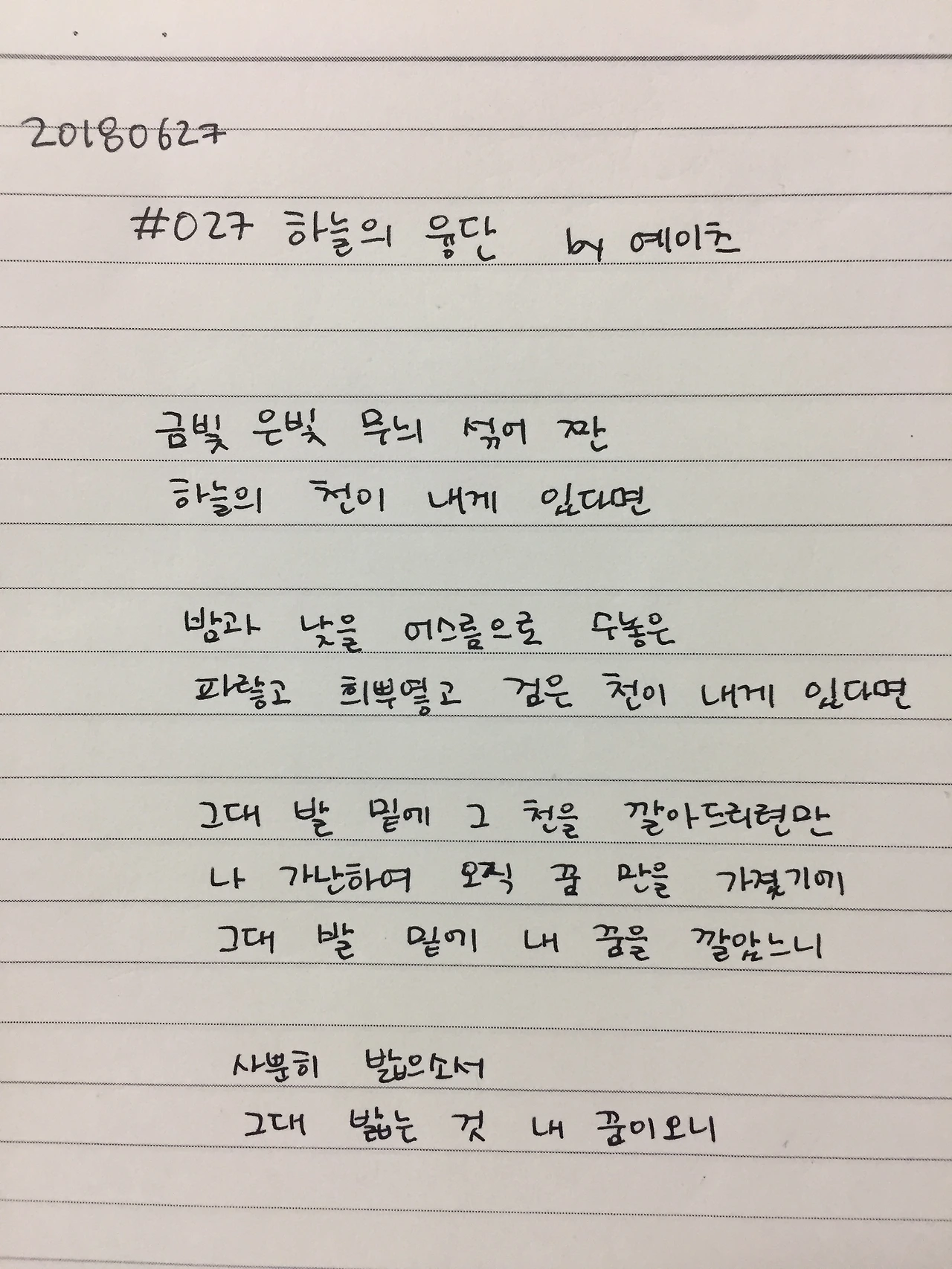 [0627] #27 하늘의 융단 by 예이츠금빛 은빛 무늬 섞어 짠하늘의 천이 내게 있다면밤과 낮을 어스름으로 수놓은파랗고 희뿌였고 검은 천이 내게 있다면그대 발 밑에 그 천을 깔아드리련만나 가난하여 오직 꿈 만을 가졌기에그대 발 밑에 내 꿈을 깔았느니사뿐히 밟으소서그대 밟는 것 내 꿈이오니