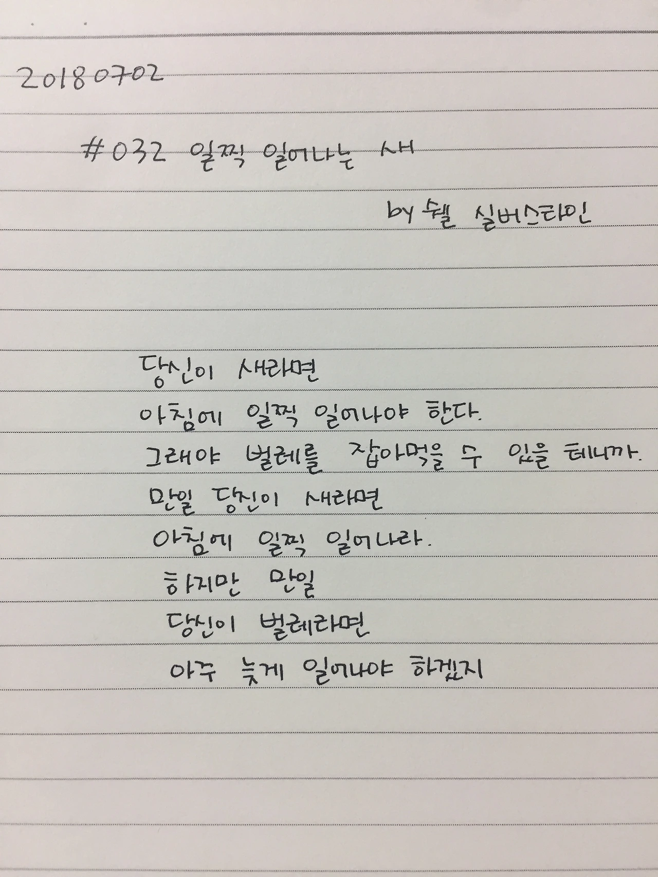당신이 새라면 아침에 일찍 일어나야 한다.그래야 벌레를 잡아먹을 수 있을 테니까.만일 당신이 새라면아침에 일찍 일어나라.하지만 만일당신이 벌레라면아주 늦게 일어나야 하겠지.#1일1시 #100lab