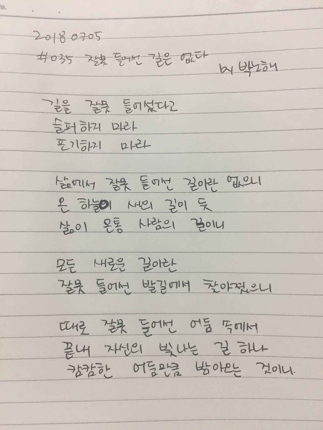 길을 잘못 들어섰다고 슬퍼하지 마라포기하지 마라 삶에서 잘못 들어선 길이란 없으니 온 하늘이 새의 길이 듯 삶이 온통 사람의 길이니 모든 새로운 길이란 잘못 들어선 발길에서 찾아졌으니 때로 잘못 들어선 어둠 속에서 끝내 자신의 빛나는 길 하나 캄캄한 어둠만큼 밝아오는 것이니#1일1시 #100lab