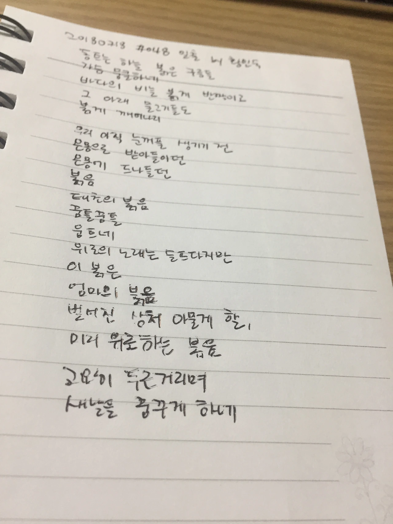 [0718] #48 일출 by 황인숙동트는 하늘 붉은 구름들가슴 뭉클하네바다의 비늘 붉게 반짝이고그 아래 물고기들도붉게 깨어나리우리 아직 눈꺼풀 생기기 전온몸으로 받아들이던온몸에 드나들던붉음태초의 붉음꿈틀꿈틀움트네위로의 노래는 슬프다지만이 붉음엄마의 붉음벌어진 상처 아물게 할,미리 위로하는 붉음고요히 두근거리며새날을 꿈꾸게 하네