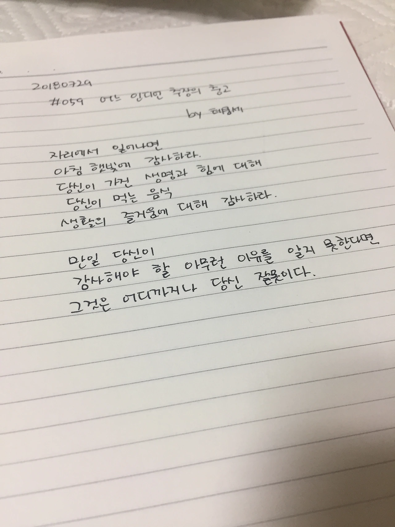 자리에서 일어나면아침 햇빛에 감사하라.당신이 가진 생명과 힘에 대해당신이 먹는 음식생활의 즐거움에 대해 감사하라.만일 당신이감사해야 할 아무런 이유를 알지 못한다면그것은 어디까지나 당신 잘못이다.#1일1시 #100lab