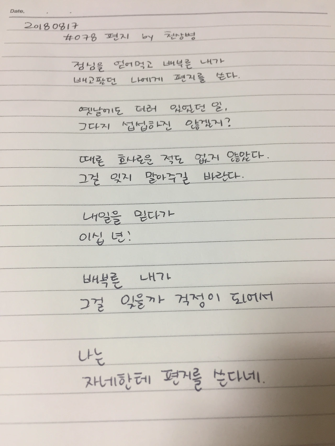 [0817] #078 편지 by 천상병점심을 얻어먹고 배부른 내가배고팠던 나에게 편지를 쓴다.옛날에도 더러 있었던 일,그다지 섭섭하진 않겠지?때론 호사로운 적도 없지 않았다.그걸 잊지 말아주길 바란다.내일을 믿다가이십 년!배부른 내가그걸 잊을까 걱정이 되어서나는자네한테 편지를 쓴다네.