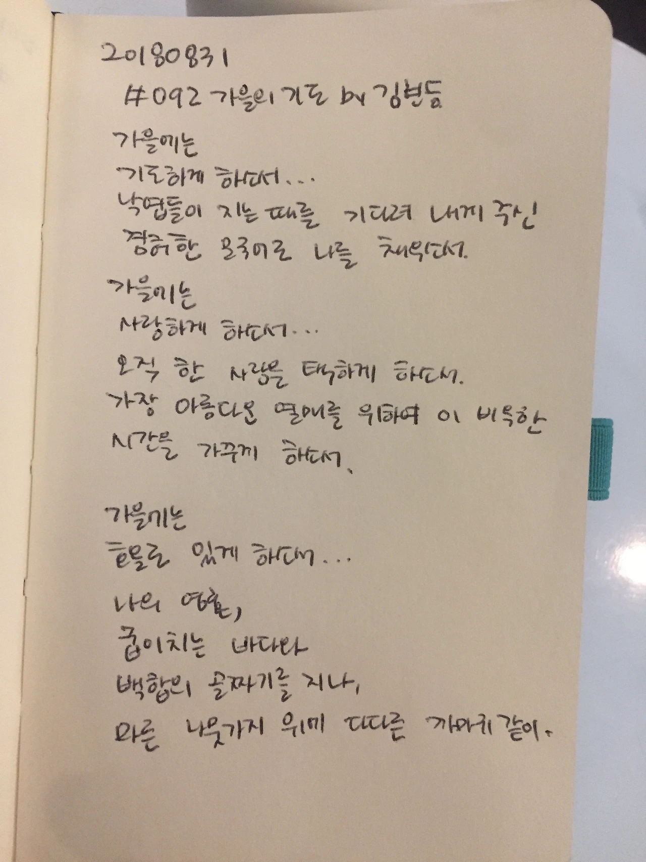 가을에는기도하게 하소서...낙엽들이 지는 때를 기다려 내게 주신겸허한 모국어로 나를 채우소서. 가을에는사랑하게 하소서...오직 한 사람을 택하게 하소서.가장 아름다운 열매를 위하여 이 비옥한시간을 가꾸게 하소서. 가을에는호올로 있게 하소서...나의 영혼,굽이치는 바다와백합의 골짜기를 지나,마른 나뭇가지 위에 다다른 까마귀같이.