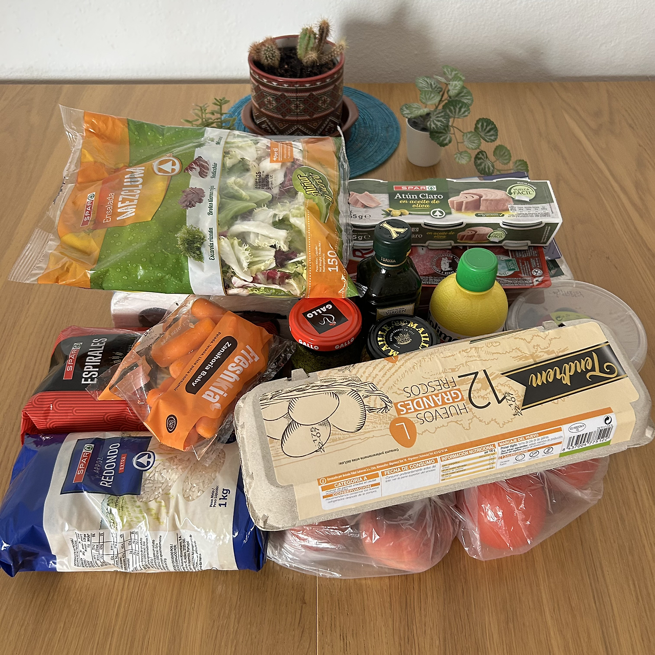 한 달 동안 생활하기 위해 필요한 기본 재료들이 많다. 쌀, 파스타, 또르띠야, 올리브오일, 레몬즙, 바질페스토, 홀그레인 머스타드, 햄, 살라미, 그 와중에 삼겹살도 있었고, 치즈, 올리브, 물, 달걀, 토마토, 과일, 샐러드 채소 등을 구매했다.