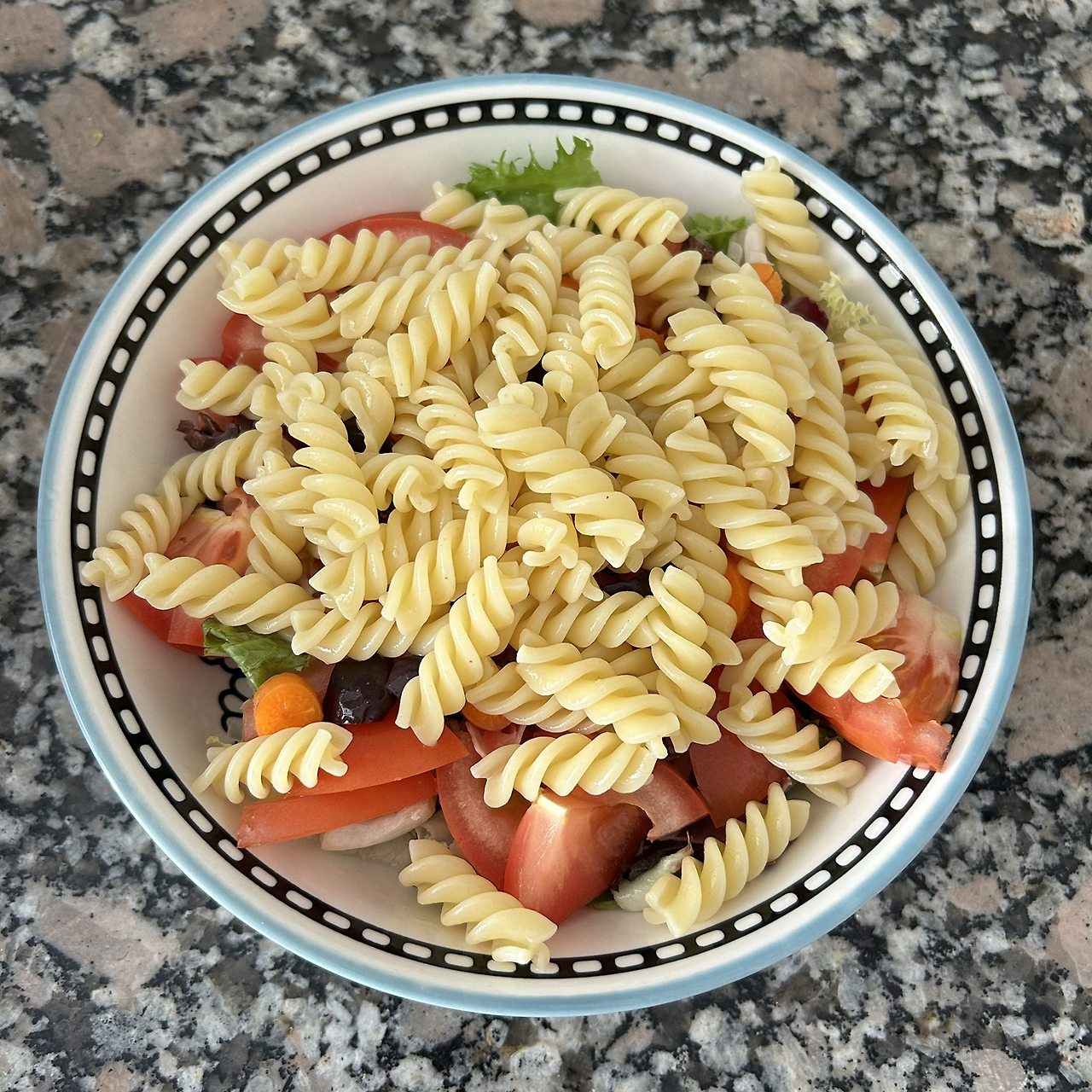 한식보다 양식이 만들기 쉬운 거 알고 있는지, 특히 파스타. 오늘처럼 더운 날에는 냉파스타 외에 다른 걸 만드는 건 불가능하다는 결론을 내렸다. 샐러드 채소, 베이비 당근, 블랙올리브, 토마토를 넣고 엑스트라 버진 올리브오일과 레몬즙으로 맛을 낸다. 밍밍하지만 아주 건강한 메뉴다. 냉파스타에는 숏파스타가 어울려서 푸실리를 삶았다. 아주 조금씩 준비한다고 했는데 다 넣고 보니 양조절 실패라서 저녁에는 조금 남은 냉파스타에 삼겹살을 구웠다. 스페인에 있는 삼겹살은 지방이 좀 더 많아서 살짝 느끼한 듯했다. 오늘은 홀그레인 머스타드를 곁들였고 다음에는 한국에서 가져온 소고기볶음고추장을 활용해 볼 예정이다. 한국에서 열심히 챙겨 온 코인육수, 사골육수 분말, 라면스틱, 볶음김치캔 등이 빛을 발하는 날이 오겠지.
