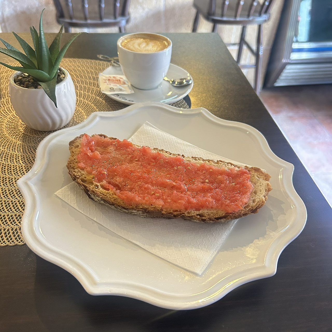 금요일이 된 기념으로 집에서 가까운 카페에서 아침을 먹었다. 보통 아침은 달걀과 토마토 정도로 간단하게 챙겨먹는 편인데, 일주일에 하루 정도는 남이 해 주는 아침을 먹고 싶었다. 카페 gorgio는 장사가 되는 걸까 매우 궁금해질 만큼 숙소 바로 옆 구석진 주택가에 있다. 어쨌든 동네 사람들이 종종 맥주를 한잔씩 하고 있는 것 같으니 유지는 되고 있는 거겠지? 매우 젊어보이는 사장님이 최근에 오픈한 듯한 새 가게 느낌이 있었다. 커다란 빵 위에 마늘과 토마토를 올리고, 거기에 근사한 꼬르따도까지 더해서 2.5유로. 기분 좋은 아침식사였다. “Que tengas un buen dìa!(좋은 하루 보내!)” 라고 인사를 하니 “Igualmente(너도)!”라고 대답해 주었다. 조금씩 일상에서 스페인어를 쓸 수 있는 내가 자랑스러운 아침이다.