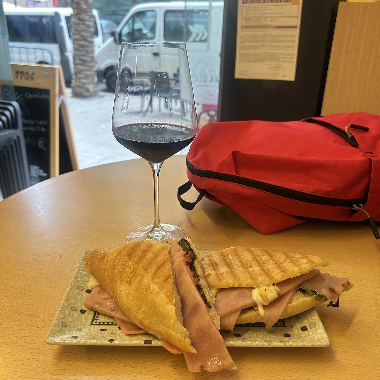 검색해 둔 카페테리아 가는 길에 그냥 눈에 띄는 카페테리아 대충 들어가기. 해산물 먹으려고 했지만 메뉴 복잡해서 그냥 아는 맛 샌드위치 먹기. 스페인어로 주문 잘했다 생각했는데 말 꼬였는지 대낮부터 레드와인 마시기.