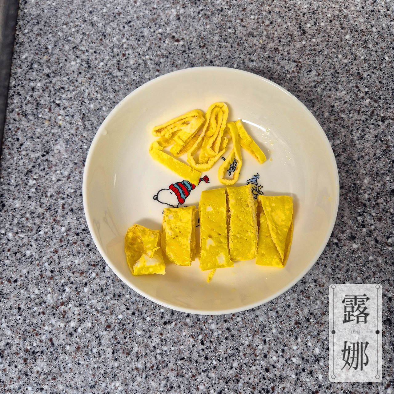 그 후엔 지단 준비하기! 계란의 흰자와 노른자를 구분하는 것은 나에게 너무 고난도라고 생각했다. 가장 쉬운 방법은 마지막에 국에다 풀어버리는 것인데 내가 좋아하지 않는 비주얼과 식감이어서 계란을 최대한 색이 균일하게 나도록 잘 섞어주고 약불로 계란말이 하듯 말아주었다. 처음 불이 셌는지 바닥 부분 색이 갈색으로 변해 예쁘지가 않았다. 보이지 않도록 한 번 뒤집어주고 빠르게 말아 꺼내주었다. 계란은 식은 후 썰어야 찢어지지 않는다고 하여 미리 준비했다. 하지만 칼질이 서툴렀는지 한참을 식힌 후에 썰어도 찢어졌지만, 지단은 어차피 조금만 사용되기 때문에 최대한 조심히 썰어주었다. 남은 부분은 반찬으로 먹기 편하게 잘라두고, 너무 안 예쁘게 찢어진 부분은 내가 먹어 없애버렸다:)