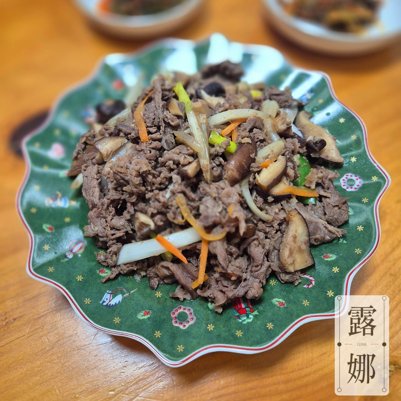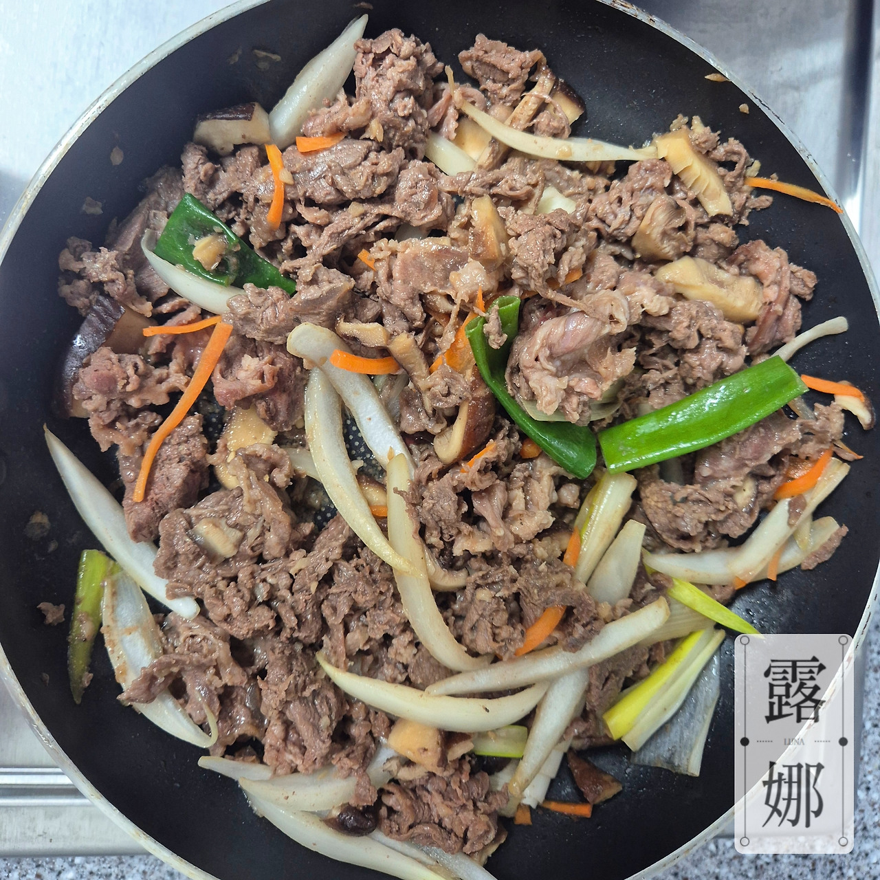 고기는 오래 재지 않고 야채를 썰어준 후 건져서 바로 볶기 시작했다. 너무 오래 익히면 질겨지기 때문에 강불에 살짝 볶아준 후 야채를 투하한다. 야채가 타지 않도록 잘 휘저어주고 적당히 익을 때까지 계속 볶아준다. 나의 경우에는 고기에서 붉은기가 사라지고, 양파가 갈색으로 살짝 변했을 때를 마무리하는 기준으로 잡았다. 양파가 너무 두꺼우면 오래 볶아야 갈색으로 변하기 때문에 야채 크기에 따라 적절히 조정하는 것이 좋을 듯하다. 소고기이기도 하고 야채 대부분이 크지 않아서 오래 볶아주지는 않아도 되었다.