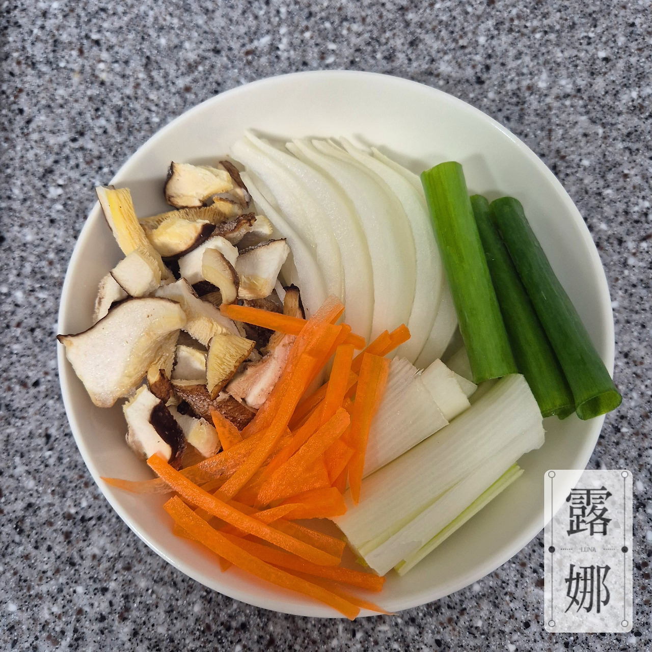 고기는 한편에 두고 야채 썰기를 시작한다. 얼려둔 표고버섯이 있어 버섯은 따로 준비해 두고, 양파와 파를 크게 썰어주었다. 생각보다 어렵고 시간이 많이 걸린 것은 바로 당근 채 썰기였다. 칼질이 서툴다 보니 채 써는 것이 익숙지 않고, 움직이는 당근을 잡고 조심조심 썰어주었다.