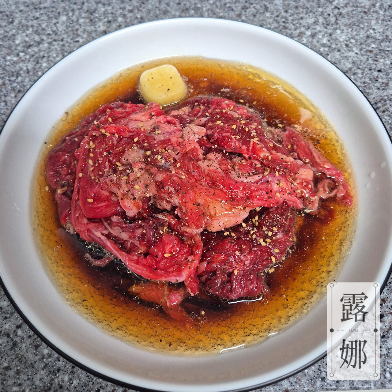 오늘은 평소와 달리 고기를 재우며 요리를 시작한다. 키친타월을 사용해 고기의 핏물을 닦아준다. 그리고 소고기 밑간을 하기 위한 양념을 넣어준다. 간장/어간장, 설탕/올리고당, 참기름, 다진 마늘, 맛술(사실 이번에도 진을 넣었다. 미안 남편:))에 야심 차게 준비한 갈아만든 배 음료수까지! 그 위에 후추와 통깨를 뿌려준 뒤 골고루 양념이 배도록 잘 버무려 주었다.