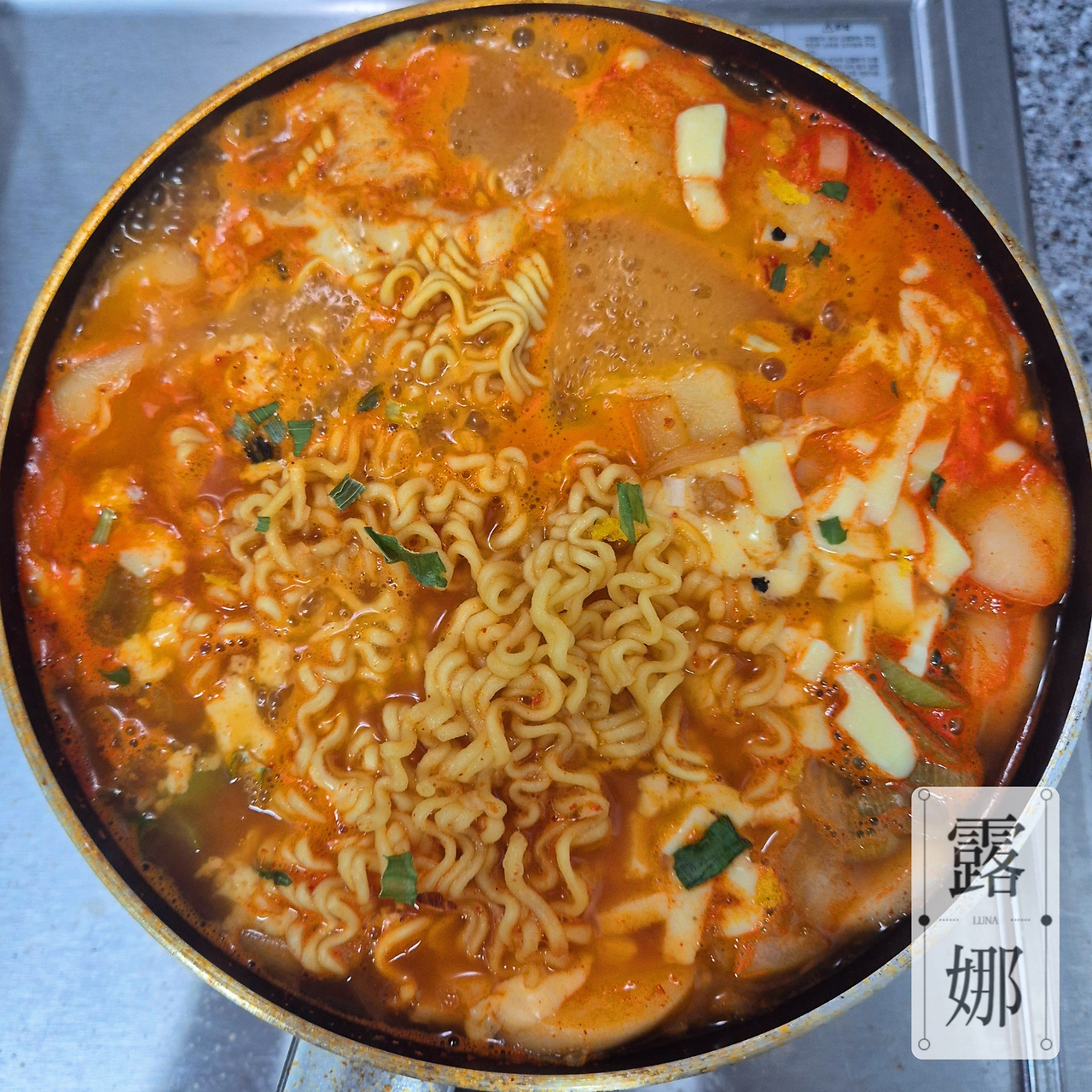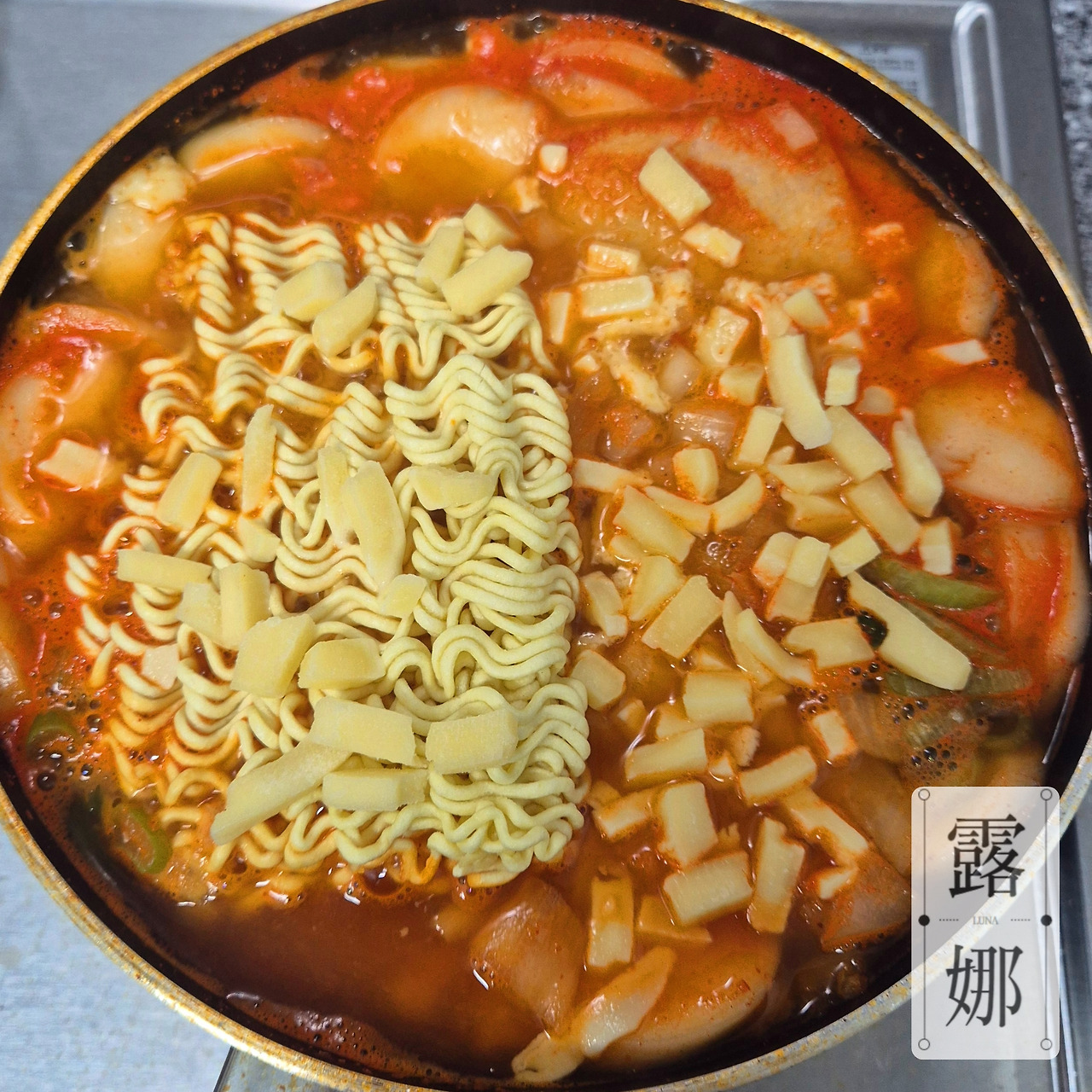 조금 매콤한 맛과 더 예쁜 색감을 원하면 고춧가루를 추가해 주어도 좋다. 떡볶이에 깻잎을 잘라서 올려 먹는 걸 몹시 좋아하는데, 오래 보관하기가 어렵다 보니 마음먹고 구매해야 해서 아쉽게도 깻잎이 없었다. 라면이 익고 치즈가 녹으면 완성!