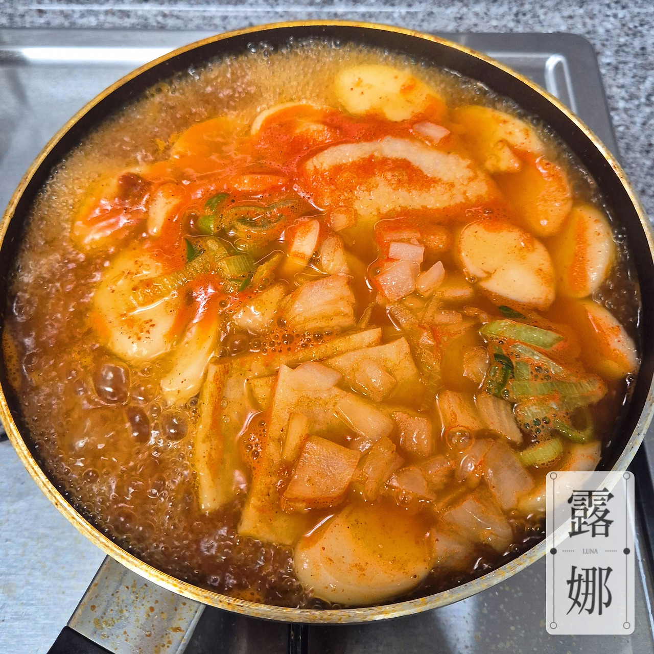라볶이에 넣을 떡과 어묵을 깨끗하게 한 번 따뜻한 물로 헹궈준다. 라면을 끓이듯 물 500ml에 고추장을 고려하여 마법의 가루인 라면수프를 1/2~3/4 봉지 정도 넣어준다. 그리고 고추장과 설탕, 다진 마늘을 추가한 뒤 떡을 투하한다. 떡이 익어갈 때 즈음 어묵, 그리고 야채(양파, 파)와 함께 끓여준다.