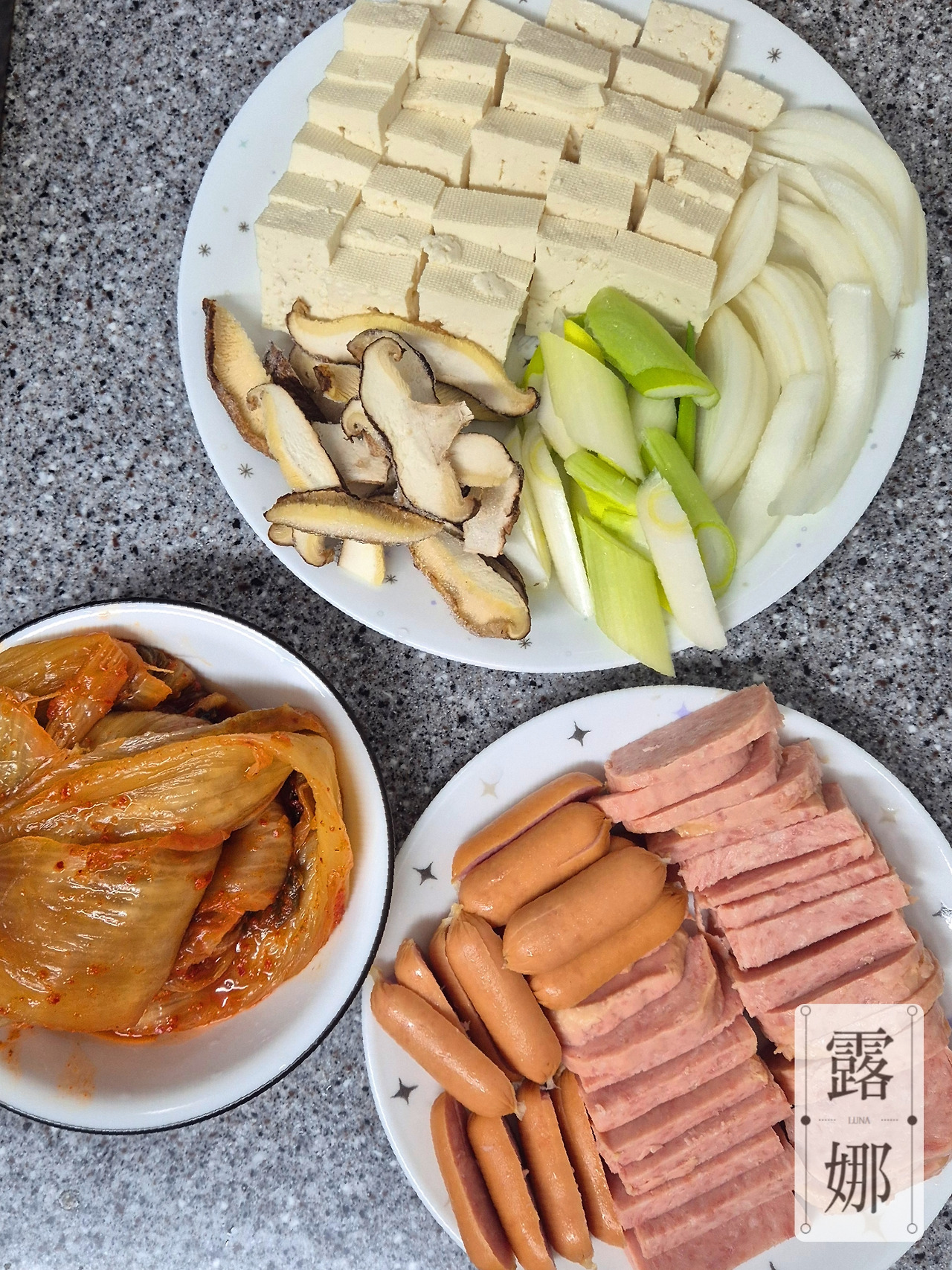 부대찌개에 들어가는 재료가 많다 보니 한 번에 미리 준비해 두어야 편할 것 같았다. 스팸, 소시지, 두부, 양파, 버섯, 파, 그리고 김치까지 먹기 좋은 크기로 잘라 주었다.