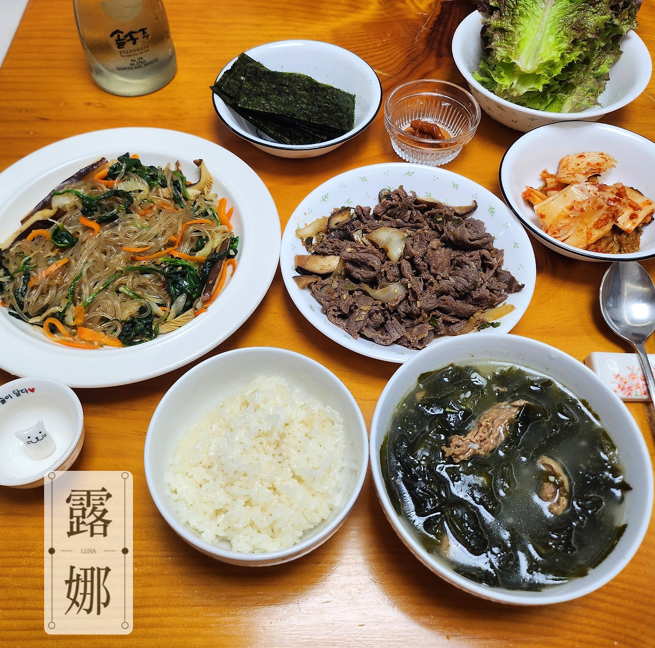 정말이지 내가 만들었지만, 너무 맛있었다. 남편도 최근에 횟집에서 먹었던 미역국보다 맛있다고 극찬을 하며 엄지를 들어 올려주었다. 미역국을 만든 날은 생일보다는 조금 거리가 있어 일부러 양을 많이 준비해서 미역국을 남겨둔 후 다른 날 제대로 생일상을 차려주었다. 예전에 시도했었던 불고기도 함께! 확실히 한 번 만들어보기도 하고, 그동안 다른 요리도 만들었더니 처음 불고기를 만들었을 때보다 손도 빨라진 듯 느껴졌다. 내가 준비해 준 생일상이지만 잡채는 장모님의 마음으로 같이 올렸다.