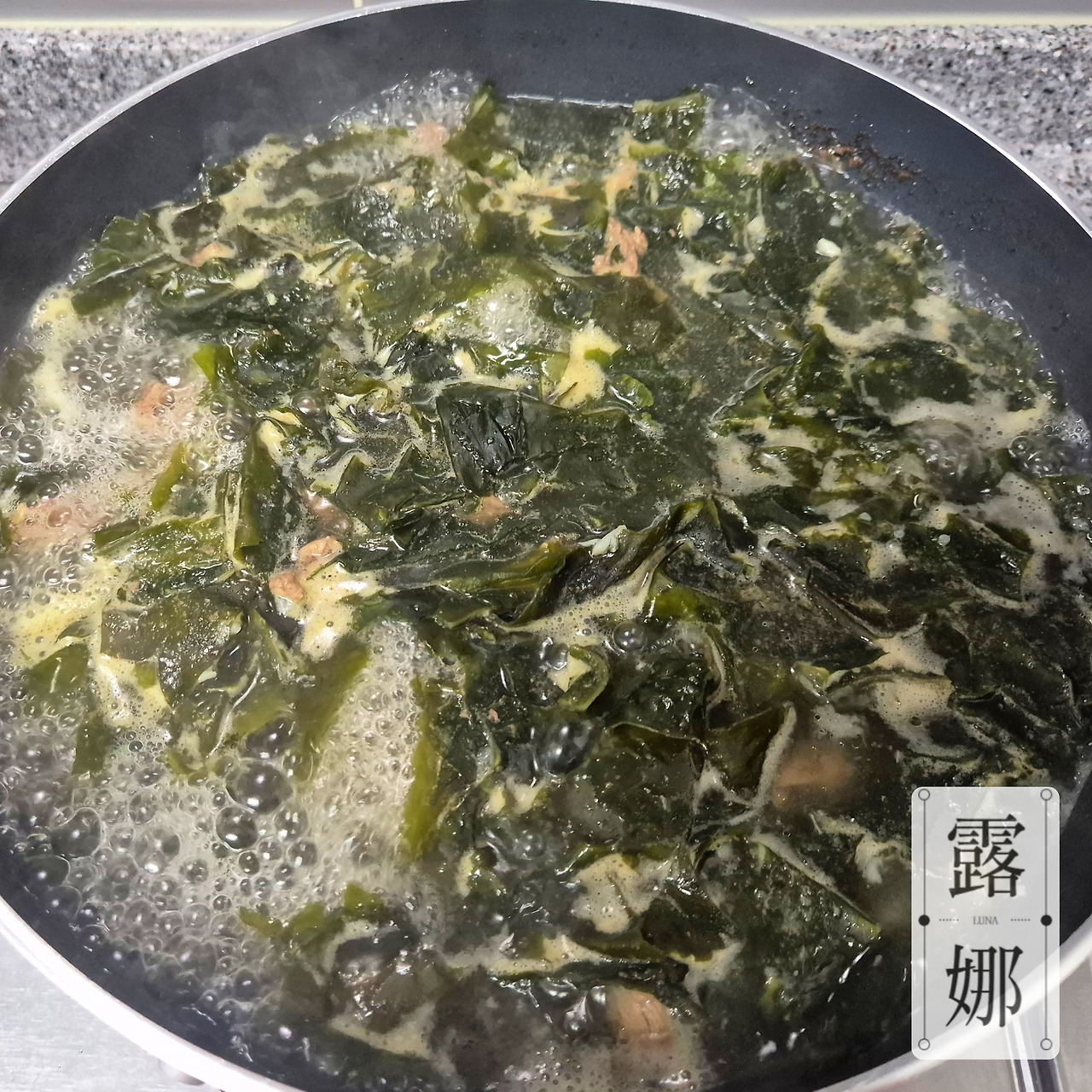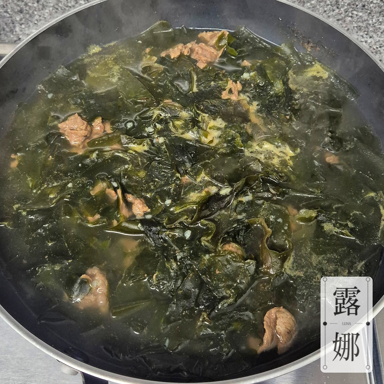 그리고 미역과 함께 물을 부어준다. 물은 처음에 500ml로 시작해 끓여가면서 추가해 주었다. 그리고 물을 추가해 싱거워졌을 수 있어 중간중간 간을 봐주면서 간장을 추가하기도 했다. 오래 끓일수록 미역의 깊은 맛이 우러난다.