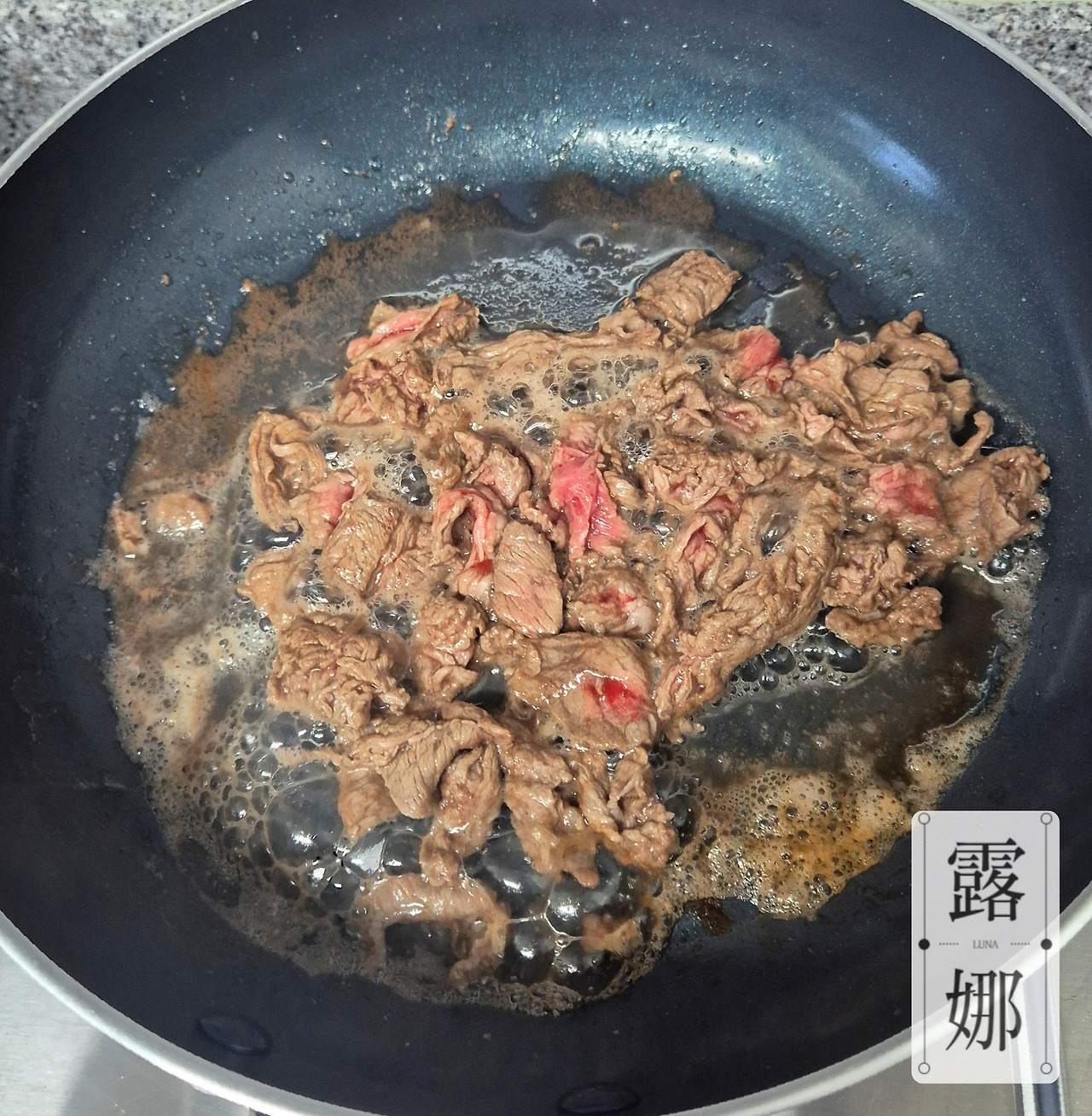 미역이 거의 다 불었을 즈음 다른 재료를 준비한다. 소고기는 키친타월을 사용해 핏물을 제거해 준다. 그리고 소고기 볶기 시작. 고기에도 간이 잘 배도록 조선간장, 어간장, 소금을 넣어준다. 나는 혹시 몰라 고기에 맛술도 조금 추가해 주었다.
