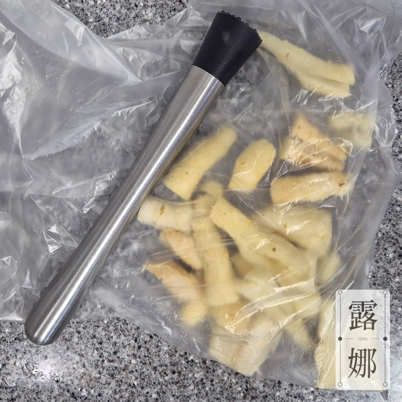 데친 더덕은 식힌 후 껍질을 벗겨주기. 긴 아이들은 껍질을 까는 게 어려워 까기 편하게 잘라주었다. 껍질을 벗긴 하얀 더덕은 세로로 이등분해 주고, 봉투에 넣어 방망이로 누르거나 두들겨 펴준다. (집에 요리용 방망이가 없어 머들러 봉을 사용했다.)