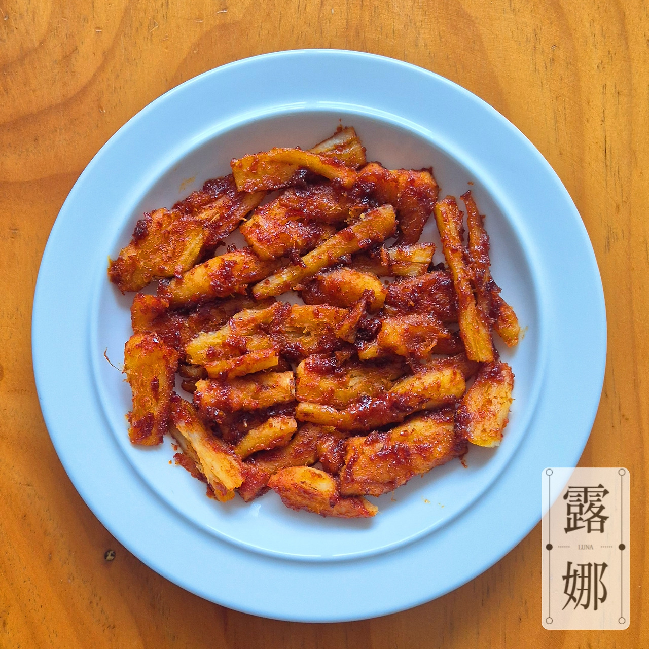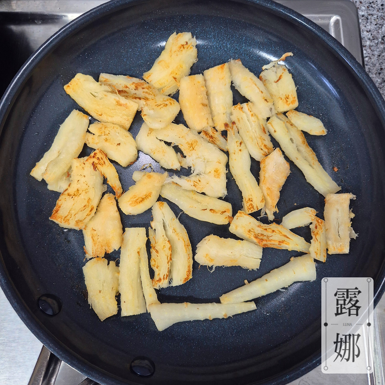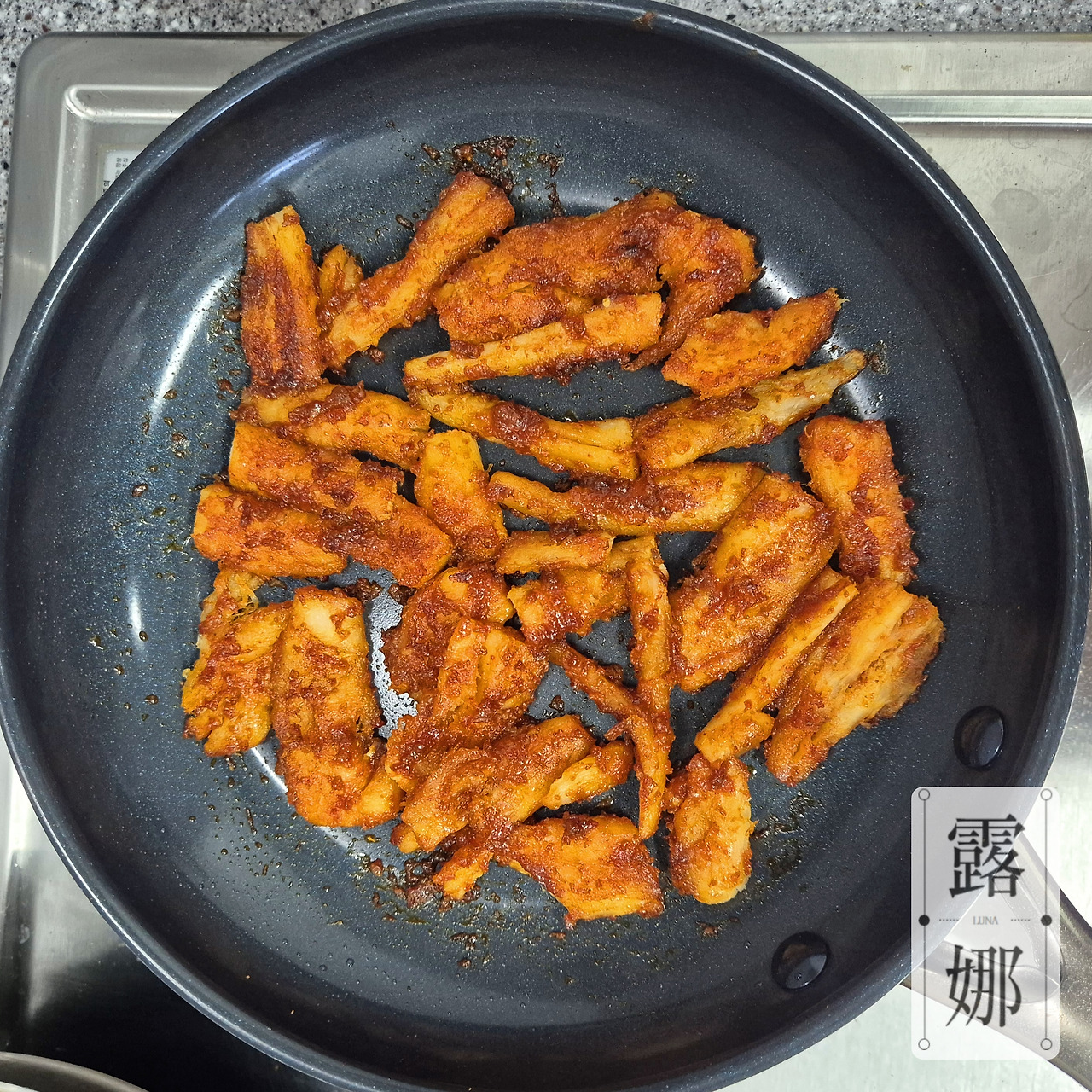 팬에 식용유를 두르고, 납작하게 편 더덕을 중불에 구워준다. 색이 노릇해지면 미리 만들어둔 양념장을 발라준 후 약불에 구워준다.