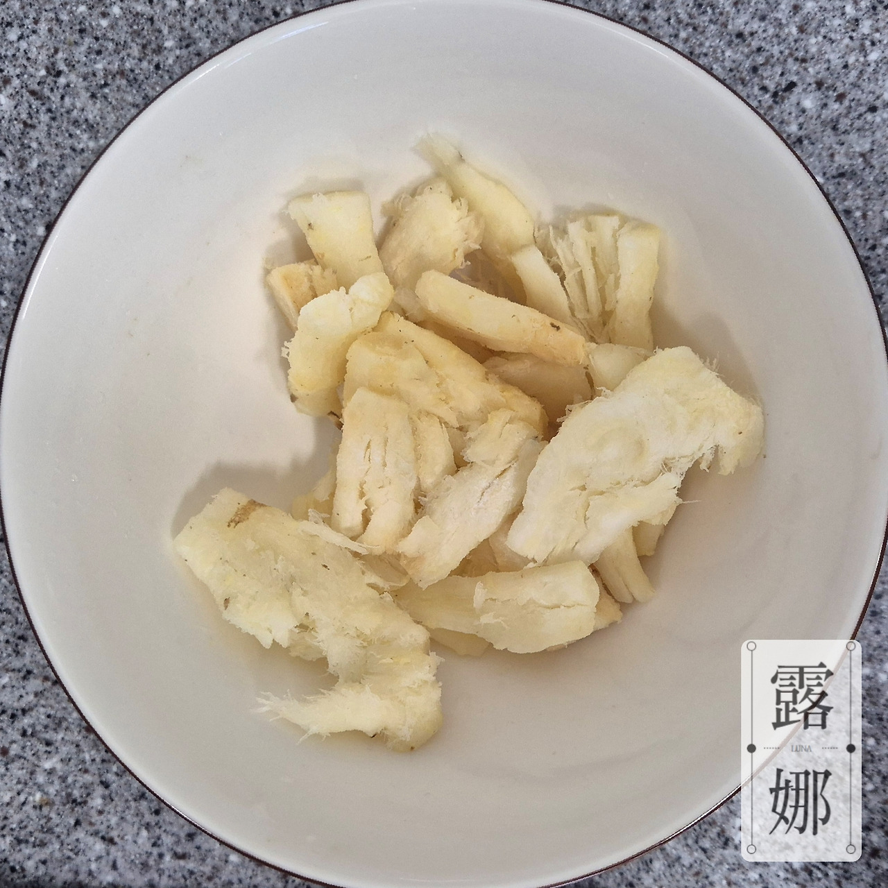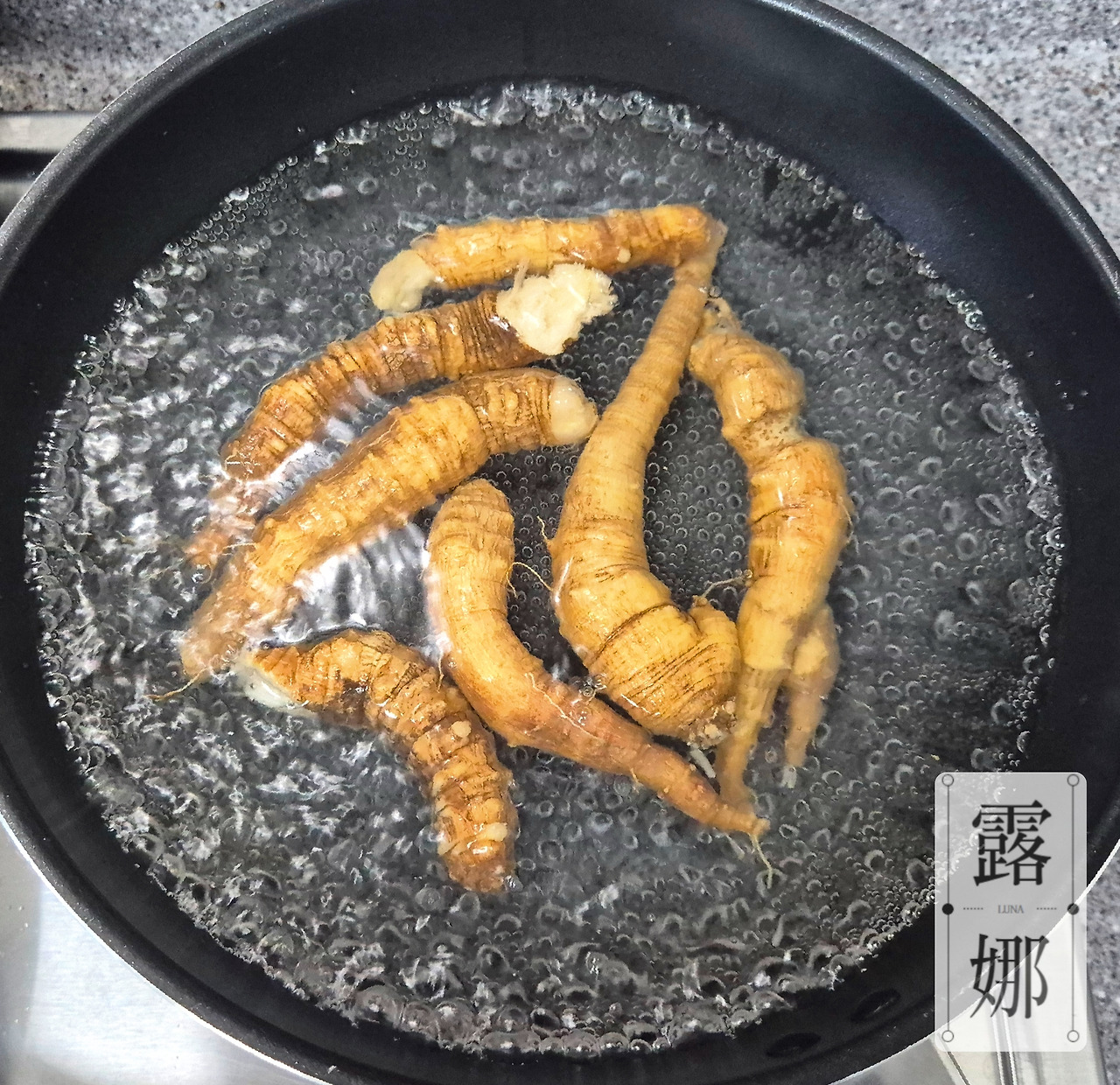 더덕을 흐르는 물에 깨끗이 세척해 준다. 더덕을 데치면 진액이 나오는 것을 막아줘 껍질을 까기 쉽다고 한다. 끓는 물에 소금을 한 스푼 넣은 후 더덕을 30초 정도 데쳐준다. 너무 오래 데치면 향이 날아갈 수 있다.