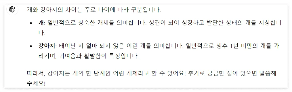 조용히 ChatGPT를 켜서 개와 강아지의 차이를 물었다.