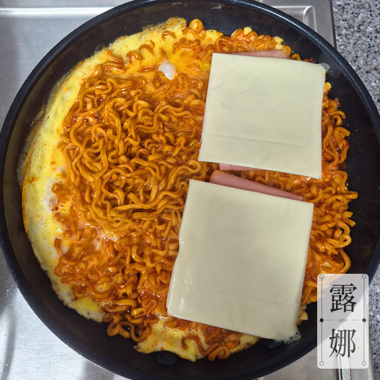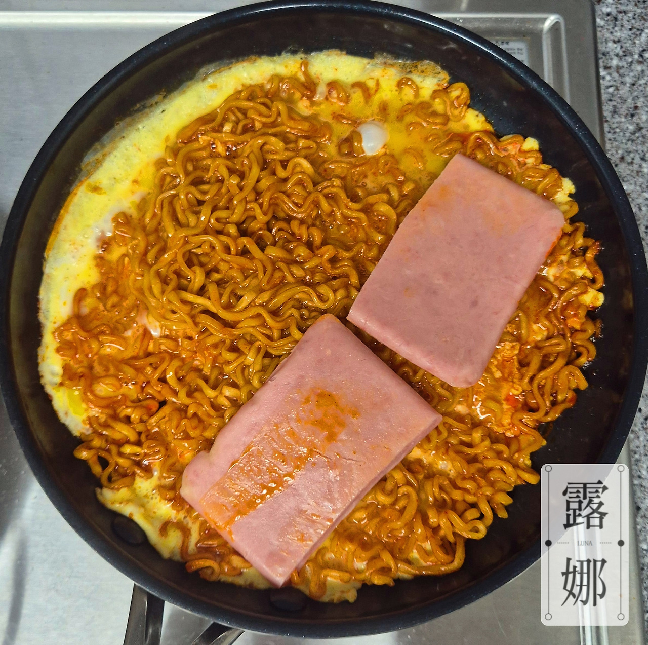 먼저 불닭볶음면 제조법에 따라 면을 삶고 소스에 비벼준다. 그리고 버터를 추가! 스팸은 끓는 물에 한 번 데쳐주었다.