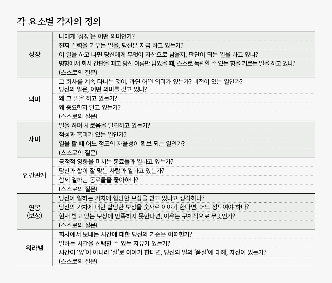 김나이 커리어액셀러레이터가 폴인에 연재한 <당신은 더 좋은 회사를 다닐 자격이 있다>에 따르면 커리어에 6가지 요소가 있다. 성장, 의미, 재미, 돈, 워라밸, 인간관계.