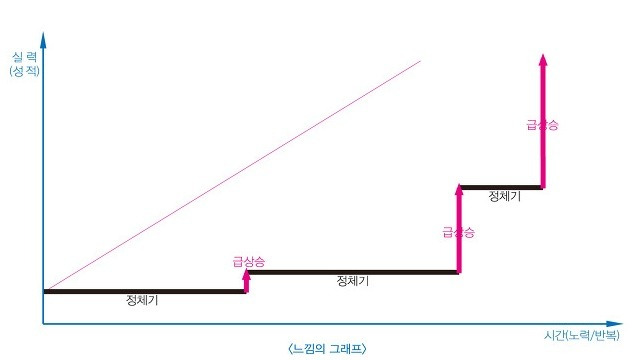 보통 다른 과목들은 적어도 교과서에 한글이 압도적으로 많습니다. 그런데, 영어는 그렇지가 않죠. 그렇다 보니 다른 과목들보다는 공부의 결과물이 늦게 나올 수밖에 없습니다. 그러나 사람 심리라는 것이 다른 과목들은 다 오르는데, 한 과목만 안 나온다면, 그 과목을 싫어하게 되고 기피하게 됩니다. 그러다가 포기까지 이어지는 것이죠. 보통 다른 과목에서 학습의 효과가 성적으로 나타나는 과정을 표현할 때 그래프가 이렇게 생겼다고 한다면,