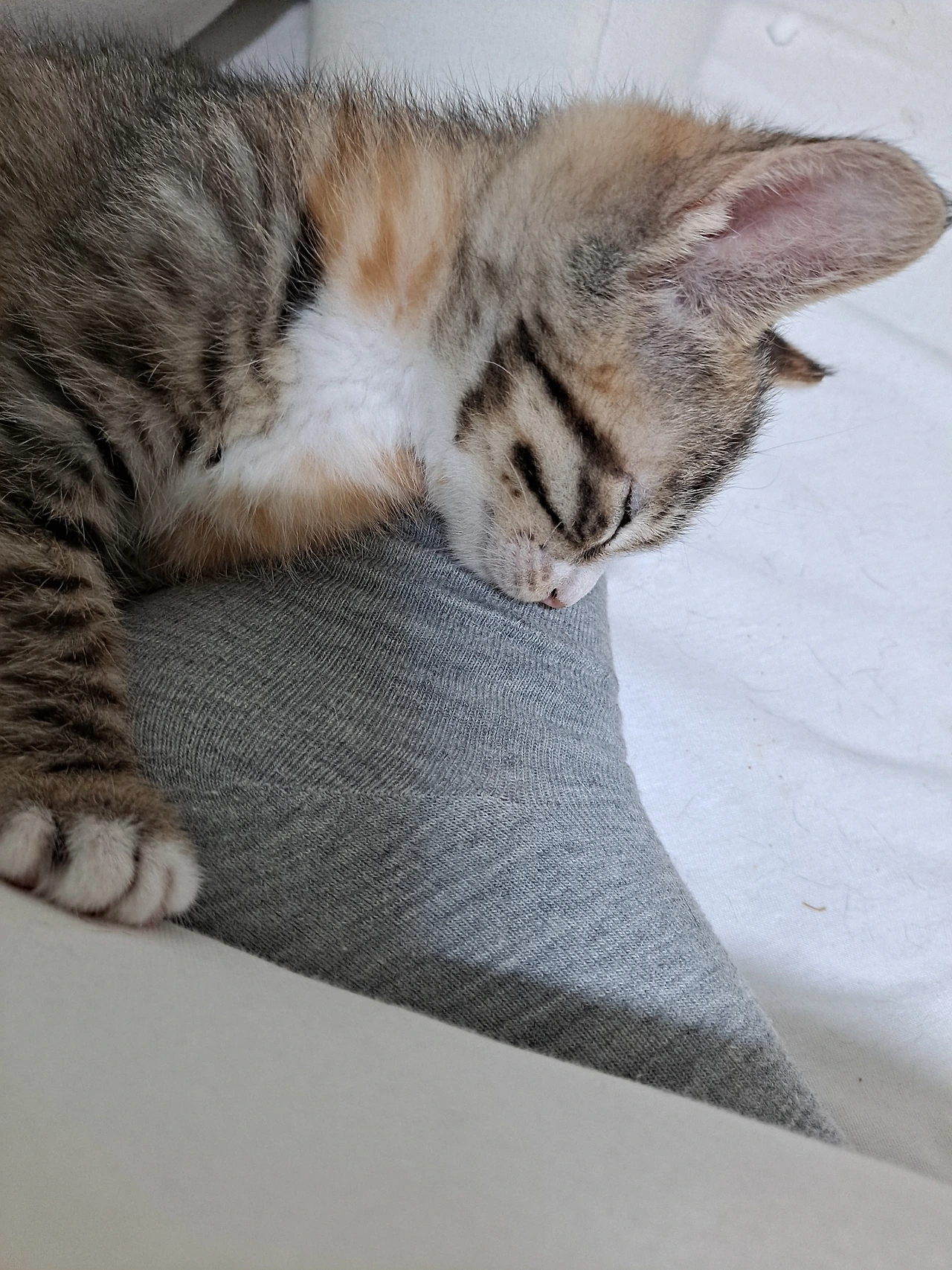 새끼 고양이는 발 베개를 하고 누워있다.