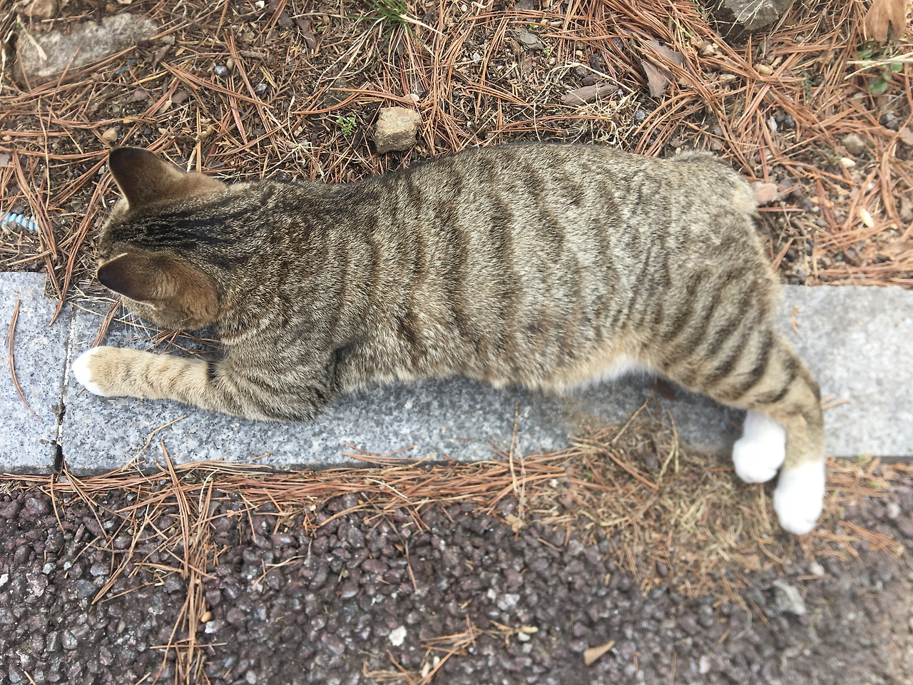 길고양이 치타_3월 7일 임신 발견한 날 (산책 후 돌아오는 길에 더워서 힘들었는지 그늘 속 차가운 대리석에 몸을 깔고 누웠다.)상가 앞 터에 자리 잡은 치타는 어렸을 때부터 상가 주인의 보살핌을 받고 있다. 숙식이 제공되니 아주 편한 자리를 차지한 셈이다. 길고양이 중에 가장 어린 고양이라 귀여워서 낙점된 것 같다.
