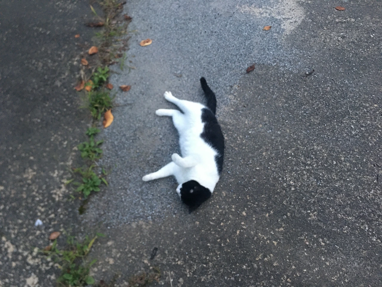 어느덧 친해져서 다리에 몸을 비비기도 하고, 엉덩이를 들이대기도 한다. 검은 털이라 하얀 비듬이나 흙먼지가 잘 보여서 피해 다녔는데, 워낙 적극적인 아이라 불시에 접촉이 있을 때가 많아졌다. 그러다가 젖소에게 벼룩이 옮았다. (오! 마이 갓!!!) 어느 날 지나가다 젖소의 아지트를 본 적이 있는데, 그야말로 흙 구덩에 나뭇가지로 덮인 야생의 장소였다. 비가 오는 날은 아마도 사람들 눈에 띄지 않는 어두운 장소에 여기저기 옮겨 다니며 지내지 않을까 생각된다.